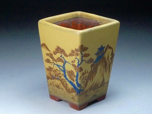 60AM46★盆栽道具 瀬戸焼 文山窯 楼閣山水文 角型 盆栽鉢 四方鉢 小鉢 豆鉢 陶器鉢 植木鉢 園芸道具 中国美術 ミニサイズ