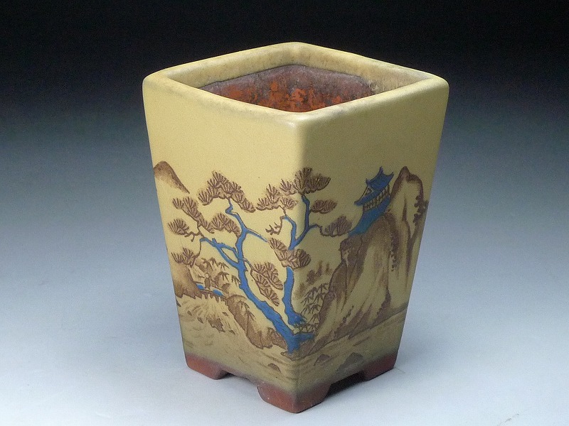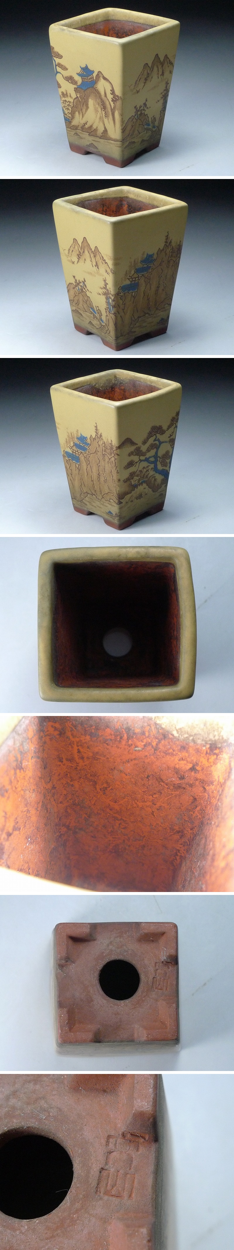 盆栽道具 瀬戸焼 文山窯 山水楼閣文 角型 盆栽鉢 四方鉢 小鉢 豆鉢 陶器鉢 植木鉢 園芸道具 中国美術 ミニサイズ