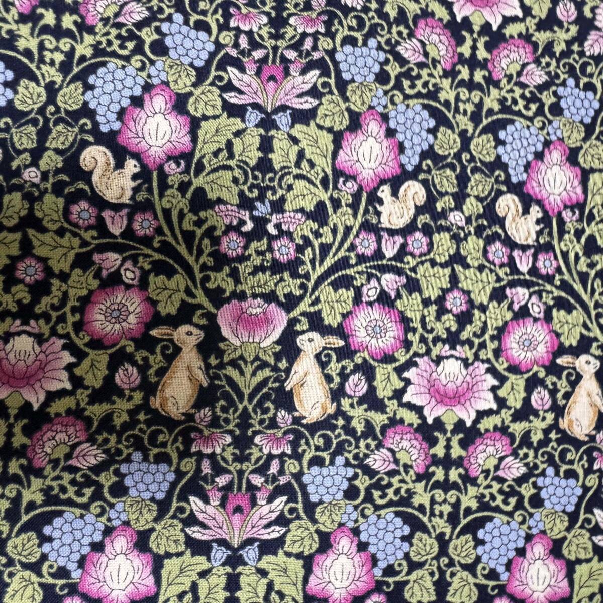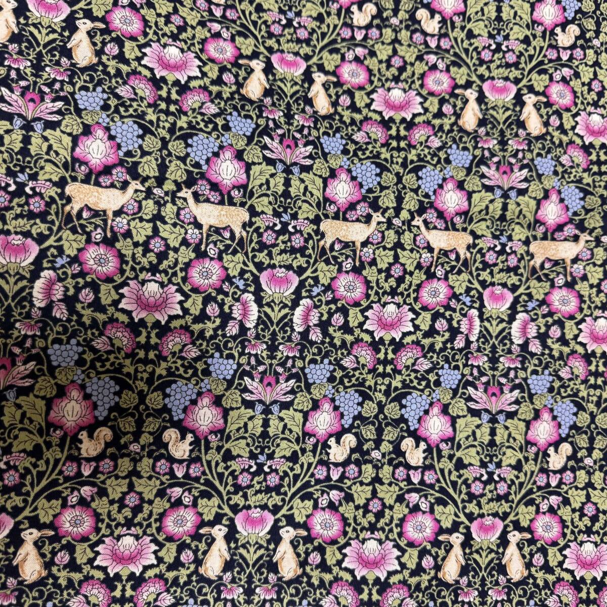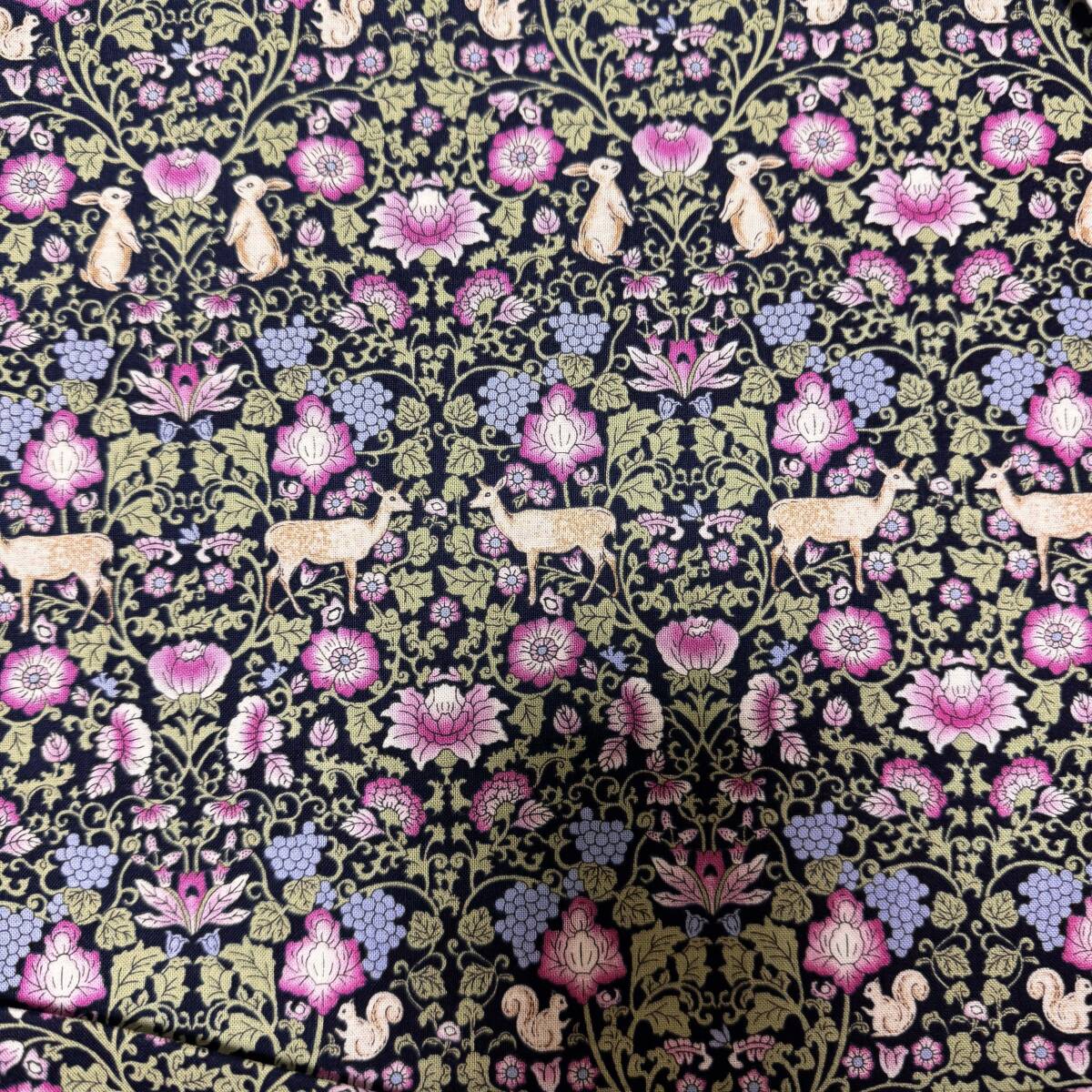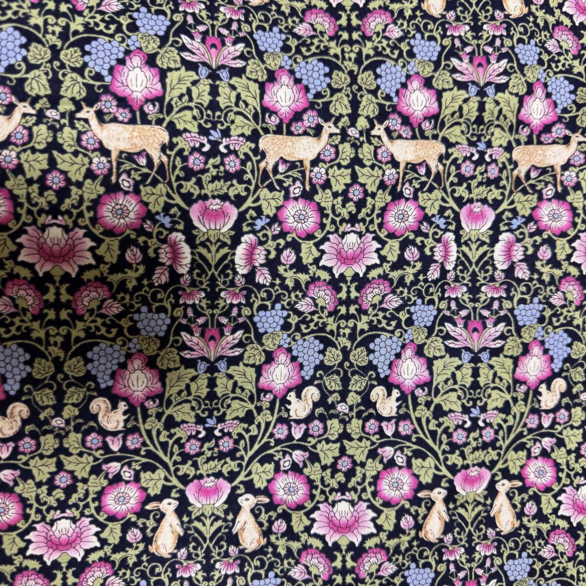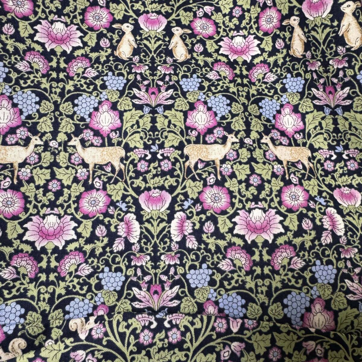 1mウサギ鹿のアンティーク風スケア生地★森の動物ダマスク植物はぎれ布ネイビーP