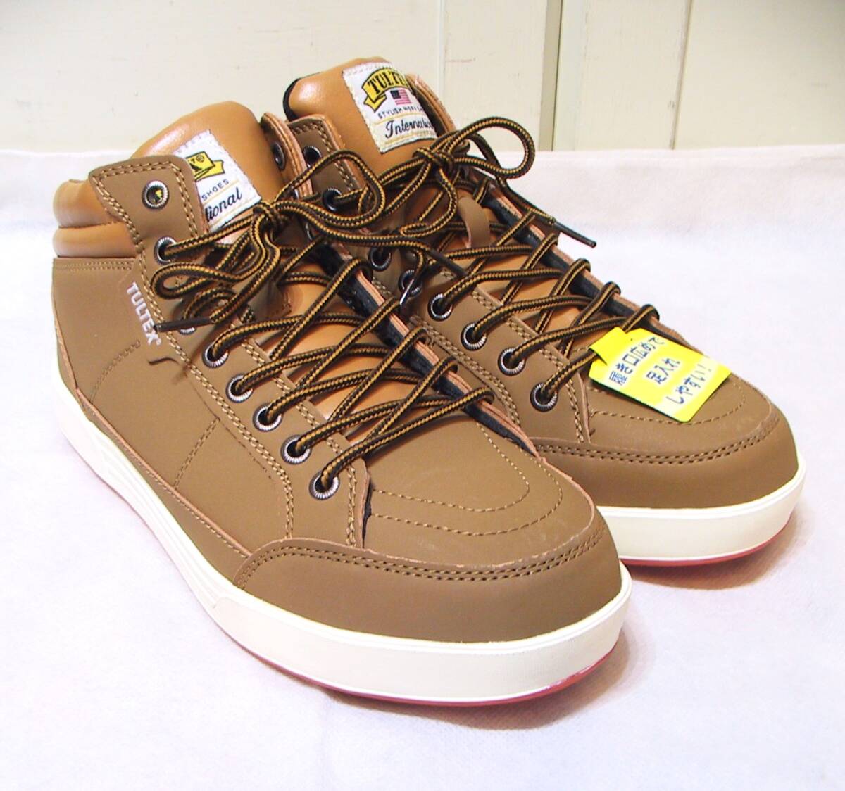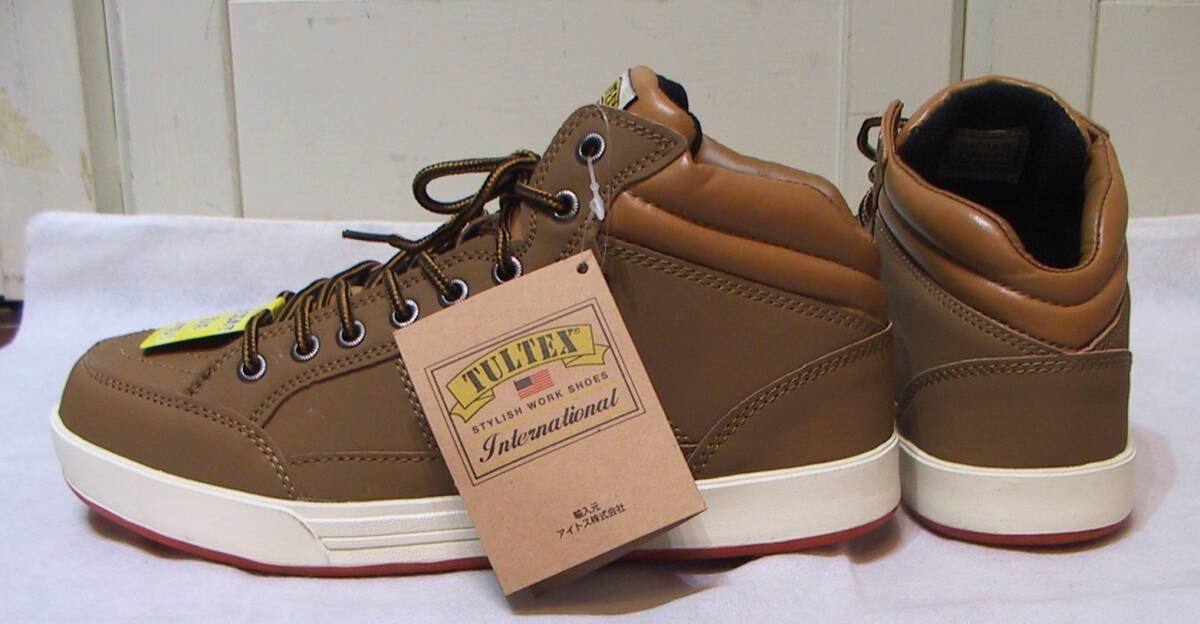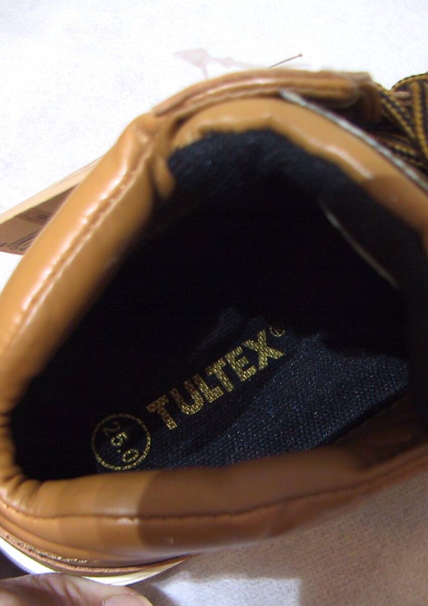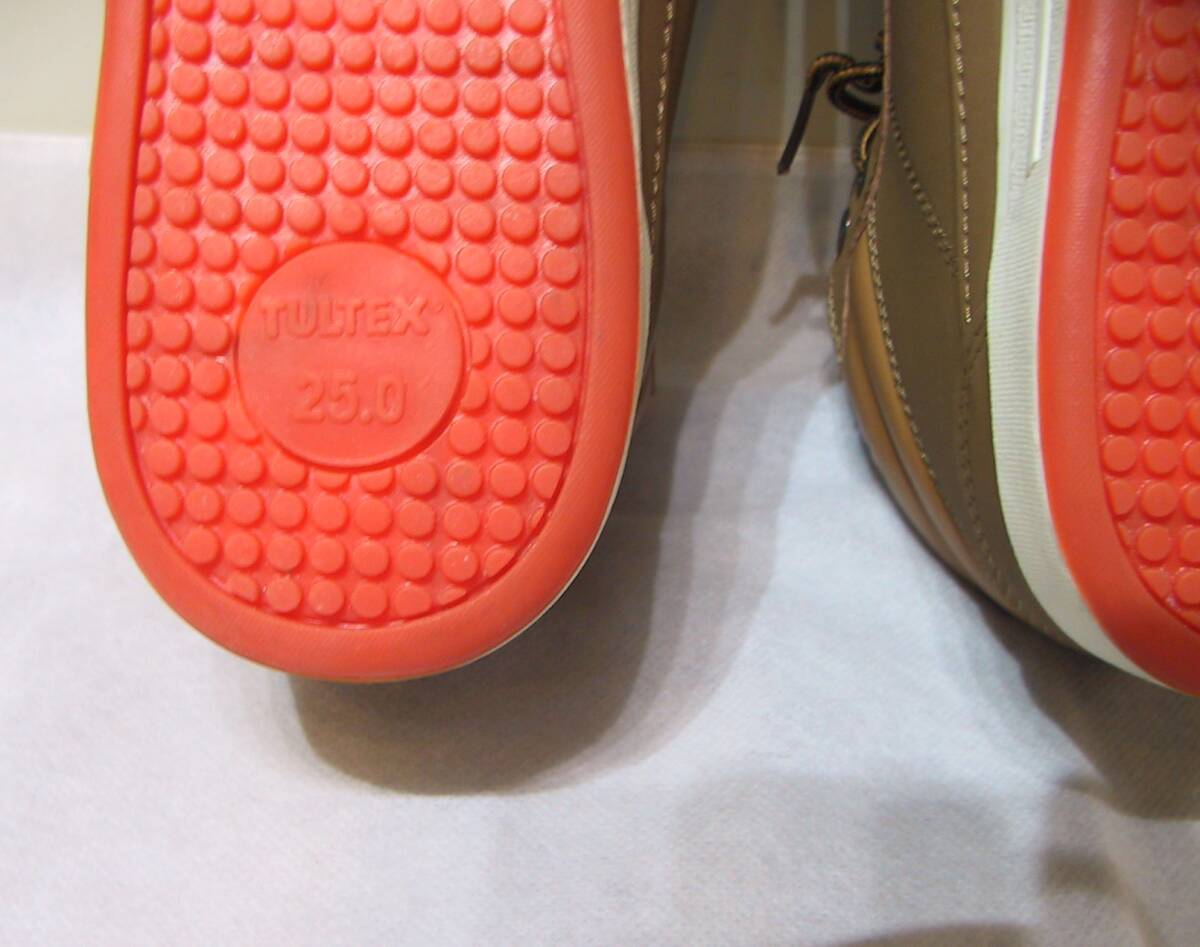 TULTEX タルテックス 安全靴 セーフティーシューズ ハイカットスニーカー、インソールクッション入り、色はキャメルです。写真2枚目のように若干変色ありますが、新品未使用タグ付きです。サイズ:25.0㎝、アウトソール最大幅10㎝、ソールの高さ2.5㎝。送料は定形外920円、ゆうパック1150円(北海道1740円、沖縄1450円)になります。