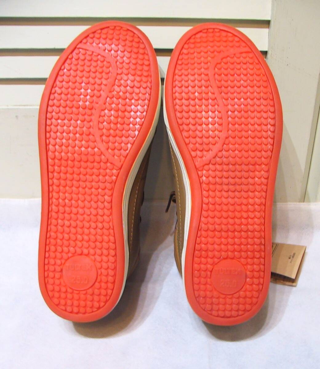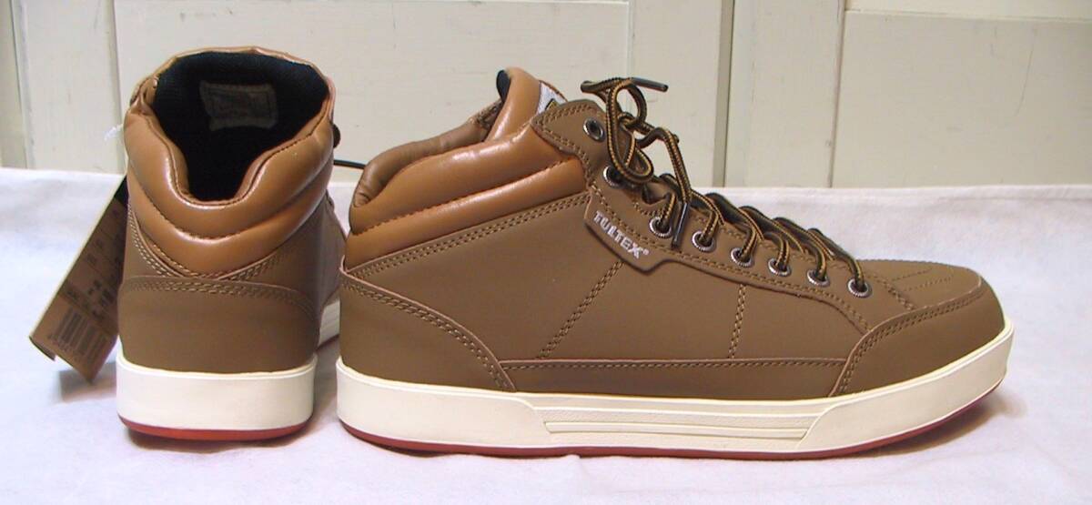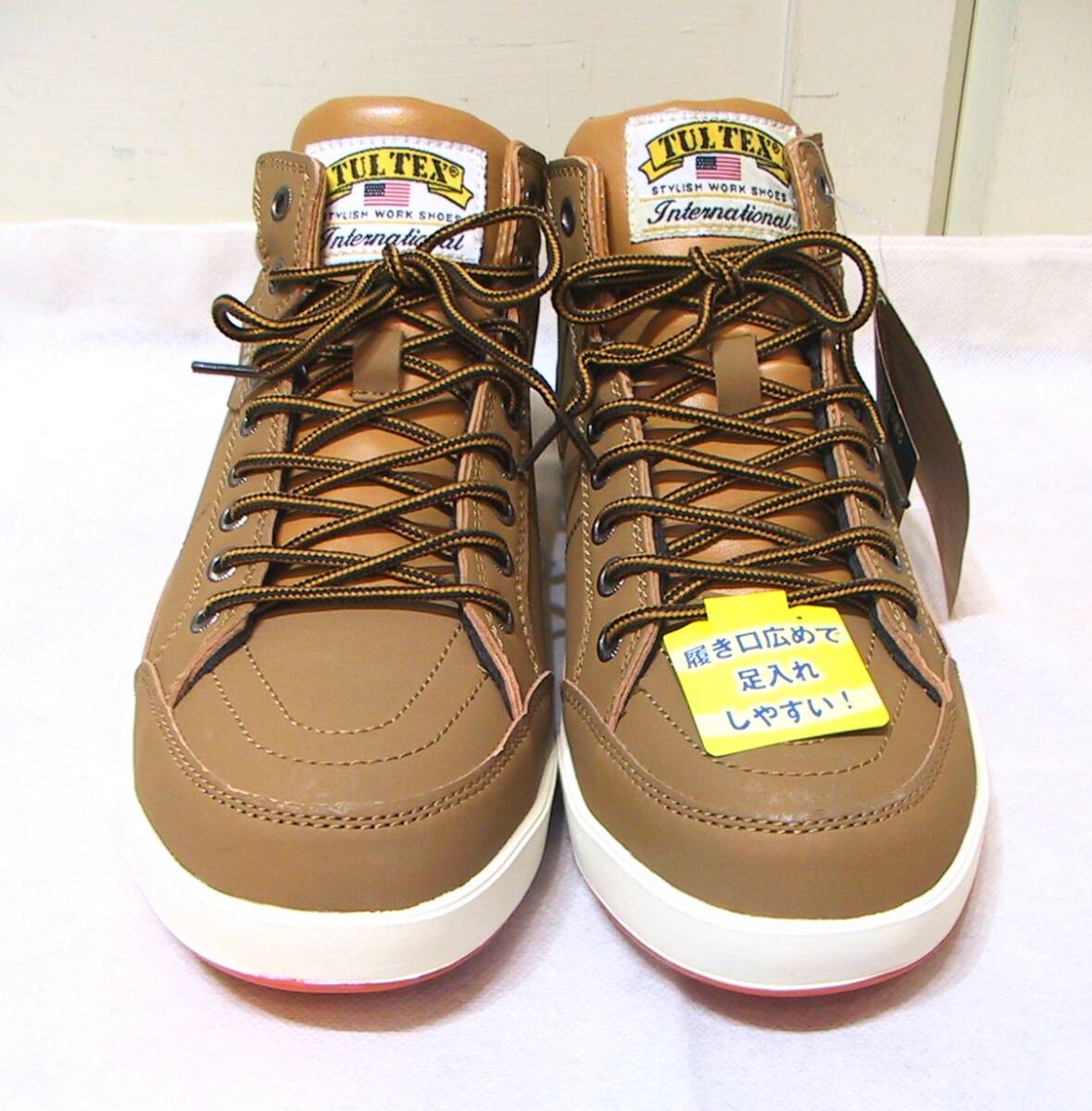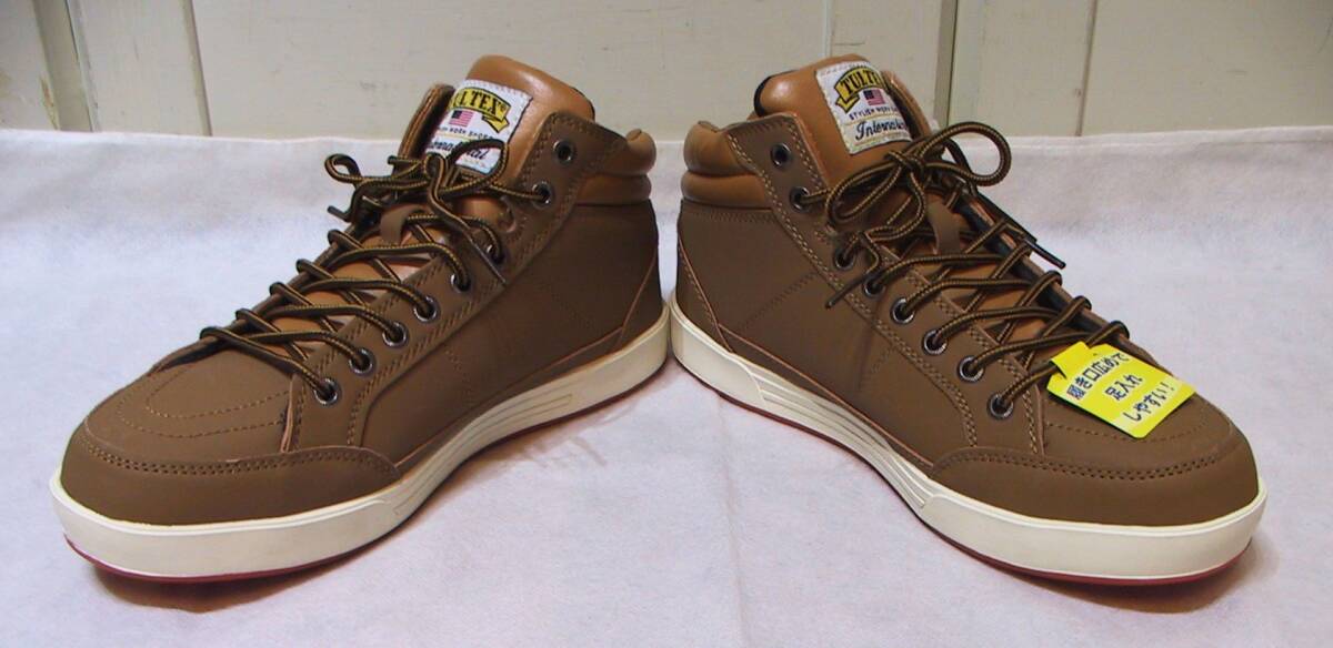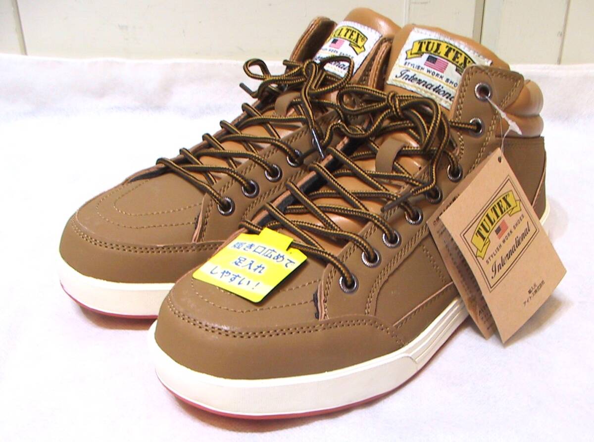 TULTEX タルテックス 安全靴 セーフティーシューズ ハイカットスニーカー、インソールクッション入り、色はキャメルです。写真2枚目のように若干変色ありますが、新品未使用タグ付きです。サイズ:25.0㎝、アウトソール最大幅10㎝、ソールの高さ2.5㎝。送料は定形外920円、ゆうパック1150円(北海道1740円、沖縄1450円)になります。
