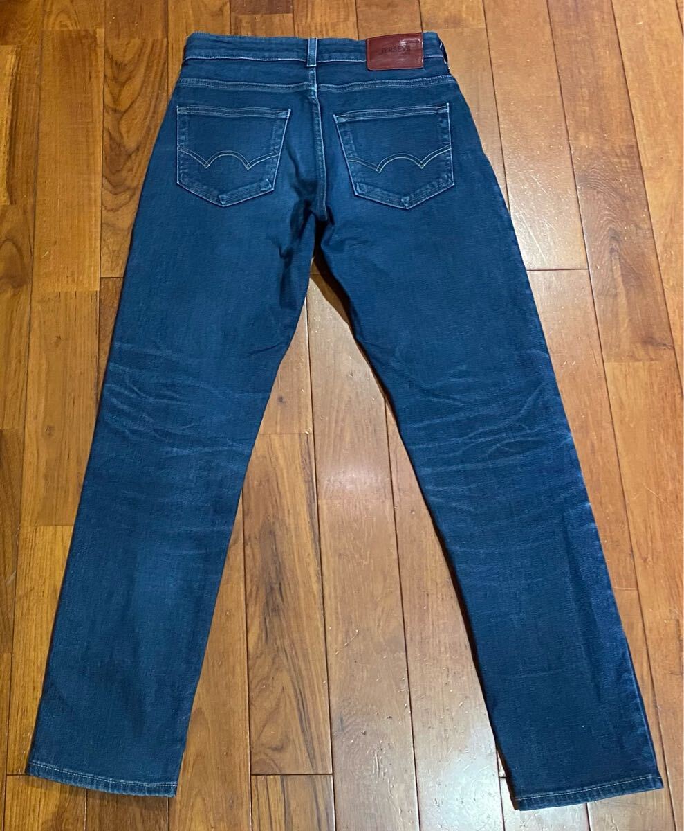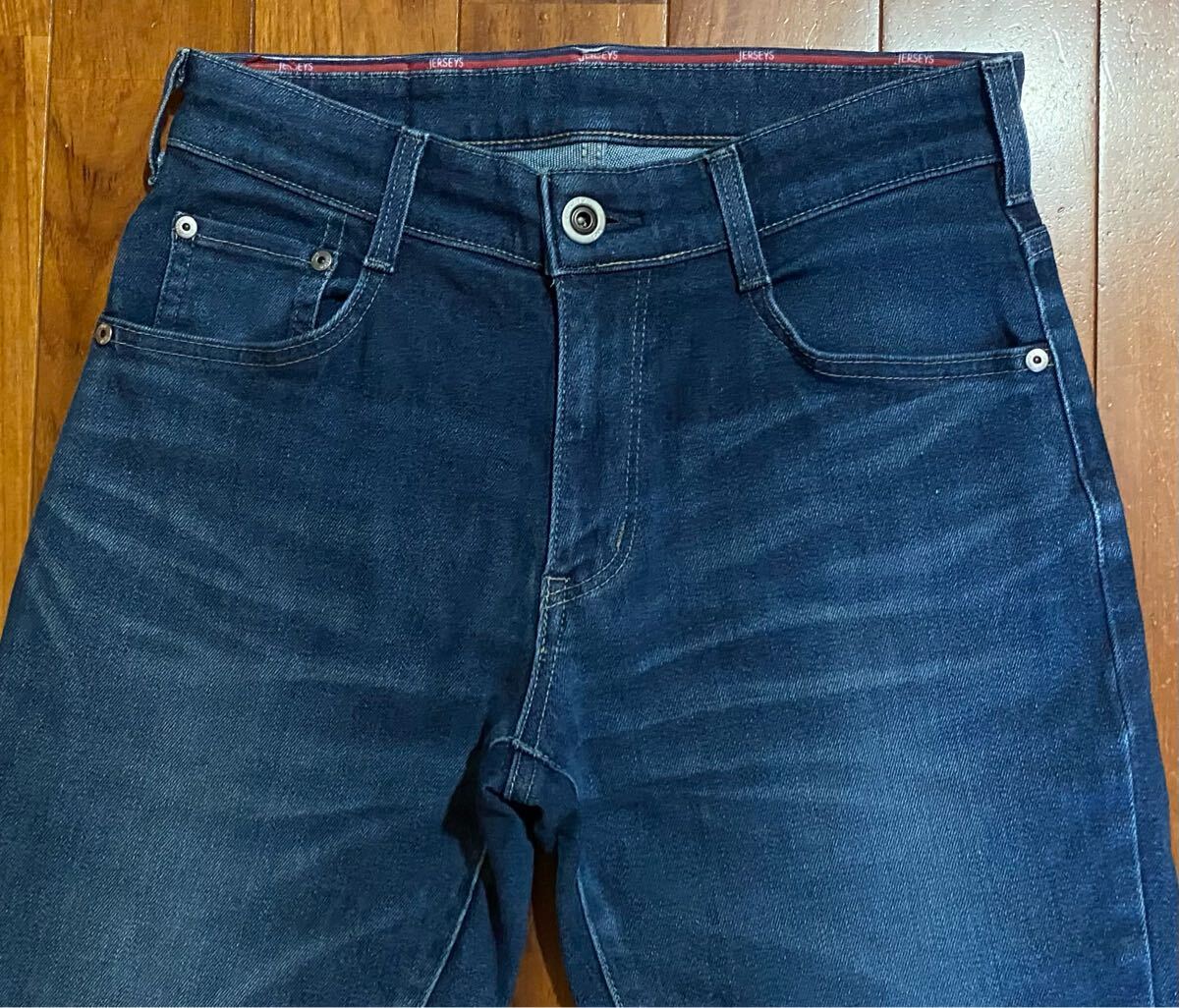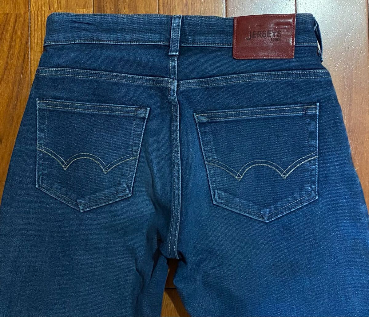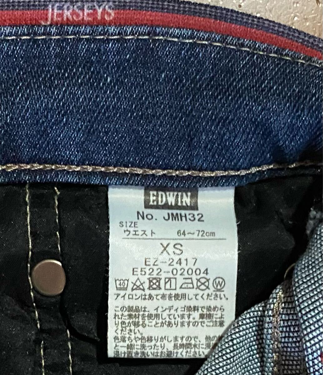 エドウィンのジャージーズ ストレッチ スリムテーパードデニム(ジーンズ)、No.JMH32です。色はインディゴブルーです。USEDですが状態は良いです(10段階中8程度)。生地はストレッチ入りで綿74%、ポリエステル15%、セルロース9%、ポリウレタン2%、ウエストリブはポリエステル95%、ポリウレタン5%です。牛革パッチ、ジッパーフライ、裾はチェーンステッチです。正規品です((株)エドウイン、日本製)。サイズはXS(ウエスト64~72cm)でウエストは重ねずに平置きで約74cm、ヒップ約96cm、股上約25cm、股下約75cm、股下15cmのふともも部分約50cm、裾まわり約34cm、重量約550gです。発送はゆうパケットポストになります。