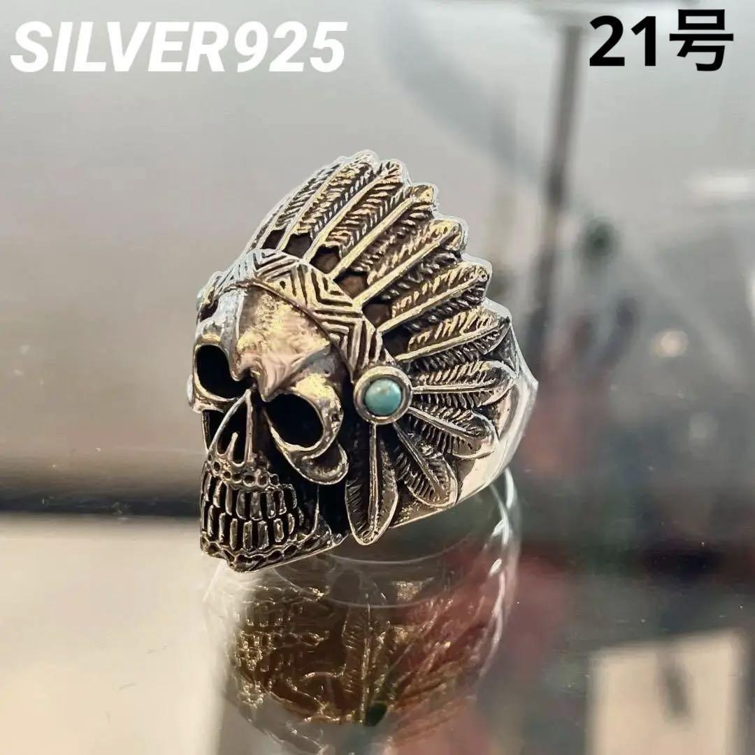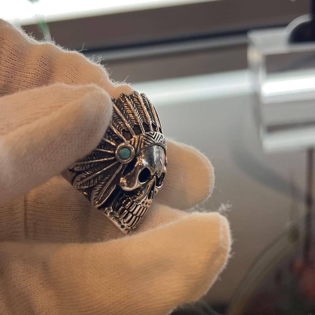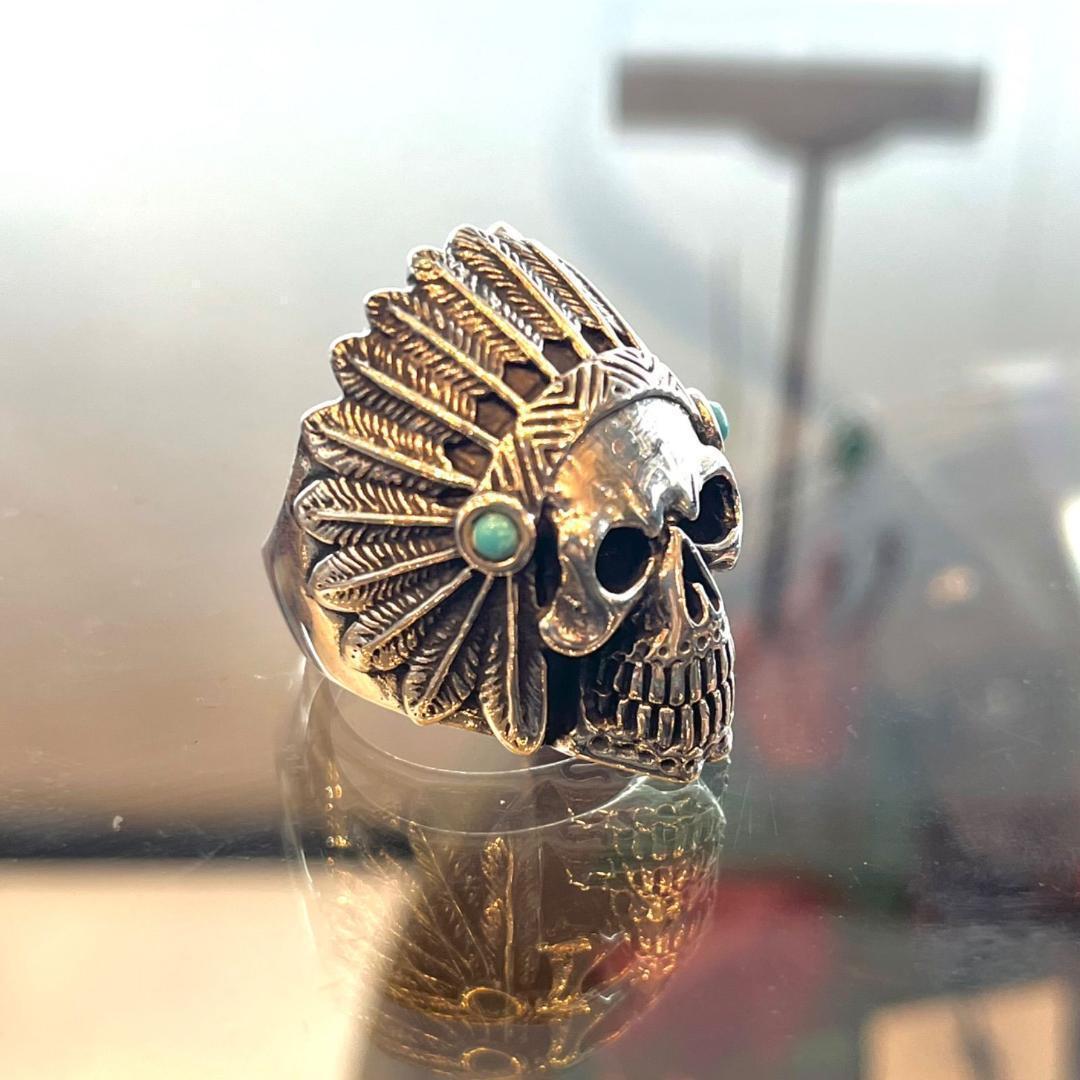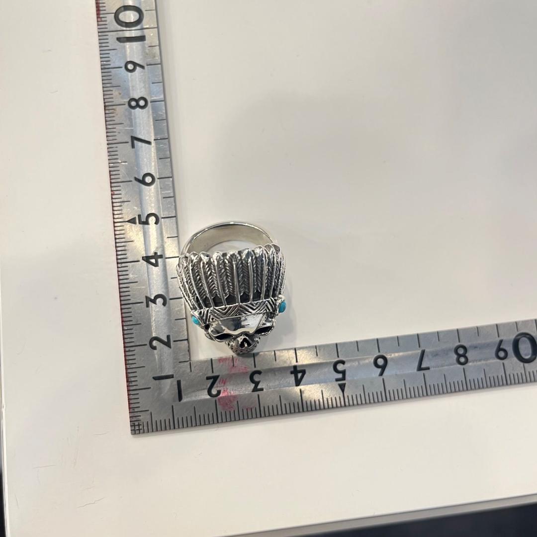 大胆で個性的なデザインが魅力の「シルバー925 スカル ヘッド リング」。ヘッドサイドには鮮やかなターコイズが施され、スカルデザインと見事に調和しています。ネイティブアメリカン風のエッセンスを取り入れたディテールが特徴で、独特の存在感を放つアクセサリーです。クールで重厚感のあるスタイルを求める方におすすめのアイテムです。