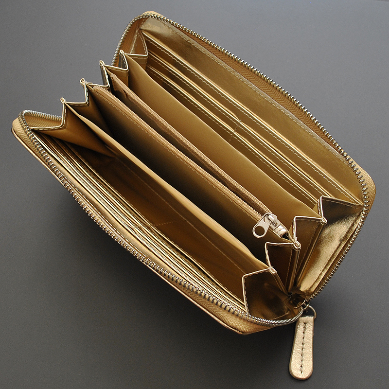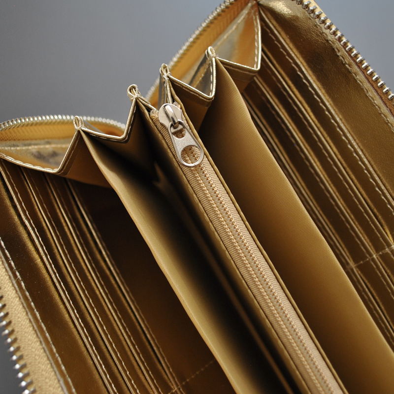 センター仕切りのファスナー小銭入れを含めた、五層に広がるラウンド内部デザインでお札やサービス券、金券やレシートなども十分に別けて収納することが可能です。