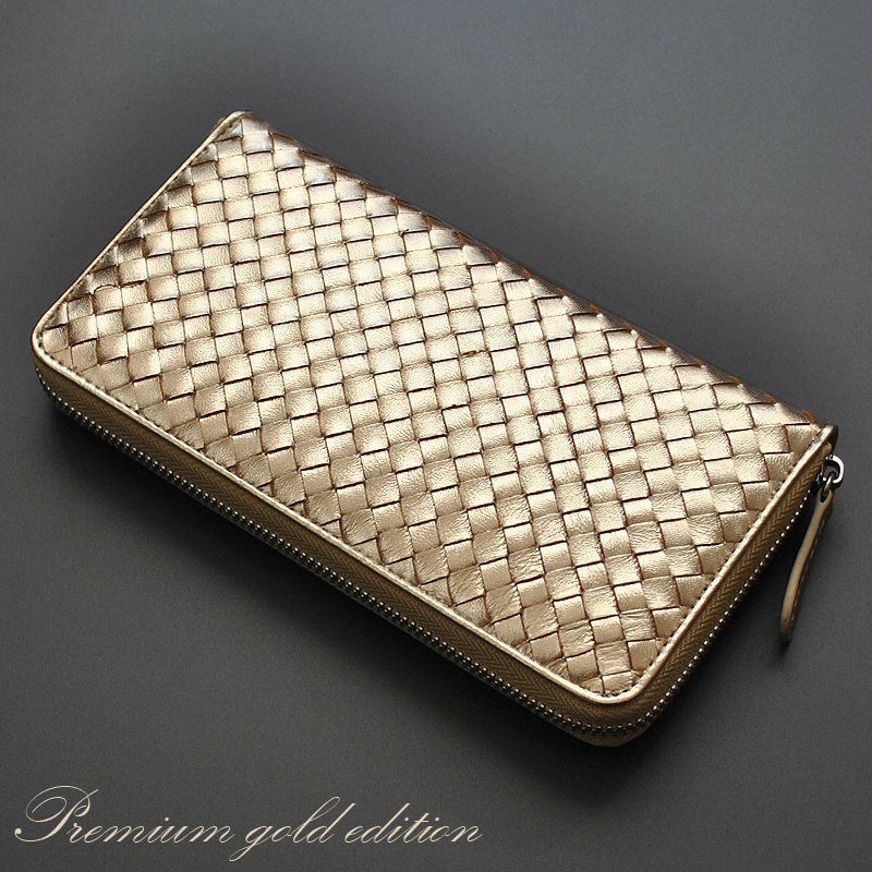 【優勝記念SALE】【送料込み】【数量限定】【新品】【長財布】シープスキン■羊革■男女兼用■編み込み加工■ラウンドロングウォレット 金