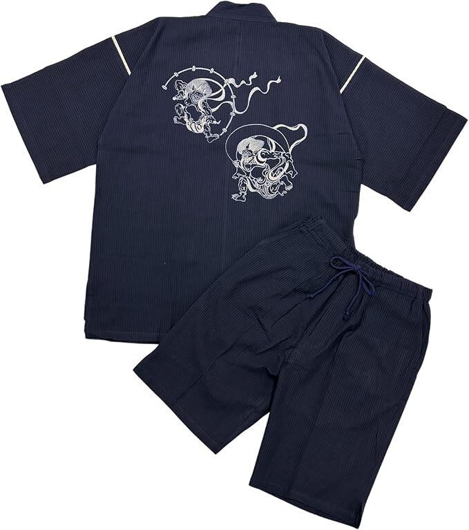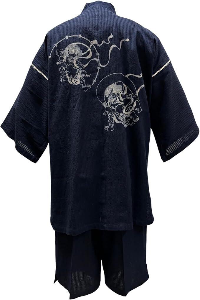 日本製久留米織り甚平 抜染 風神雷神 紺 Mサイズ