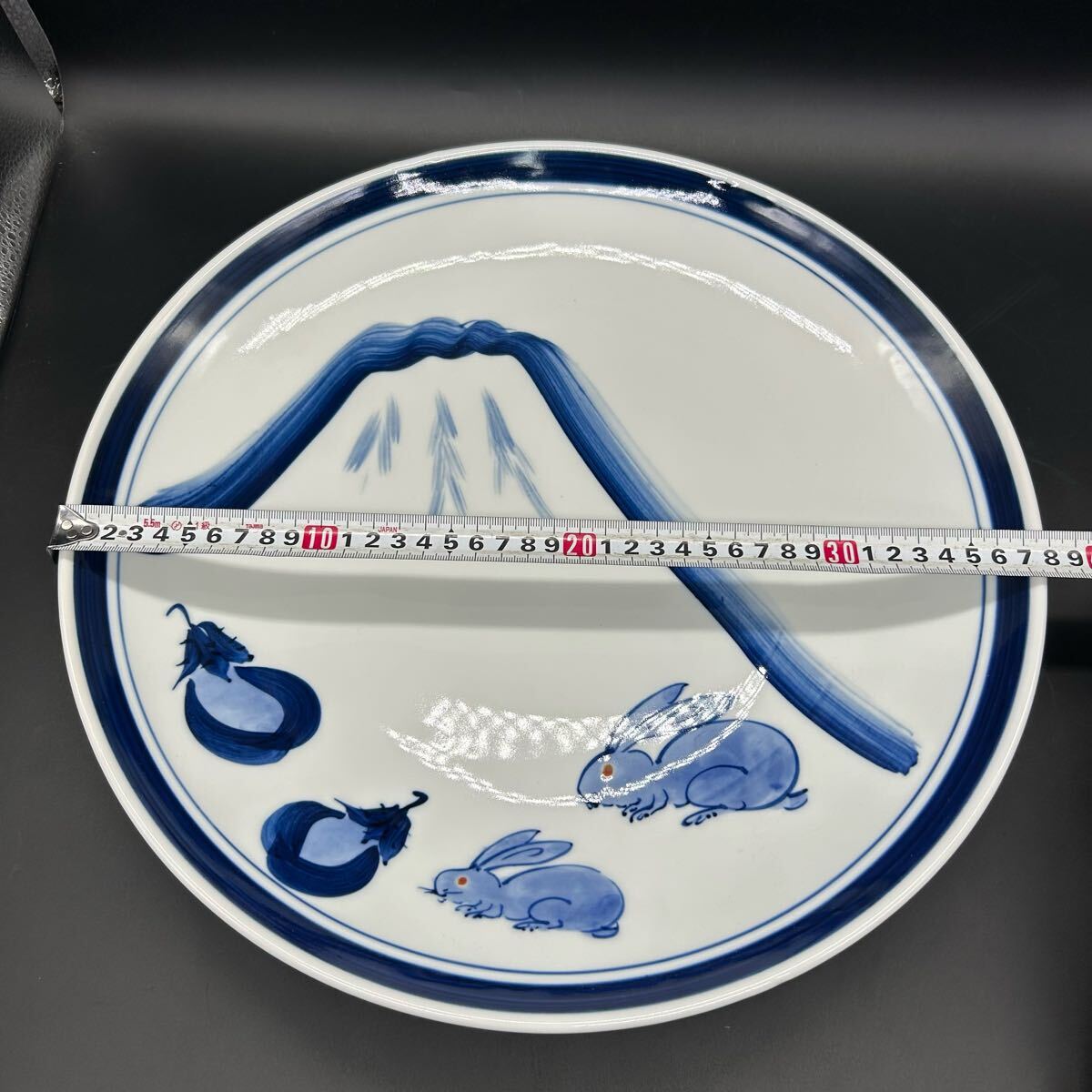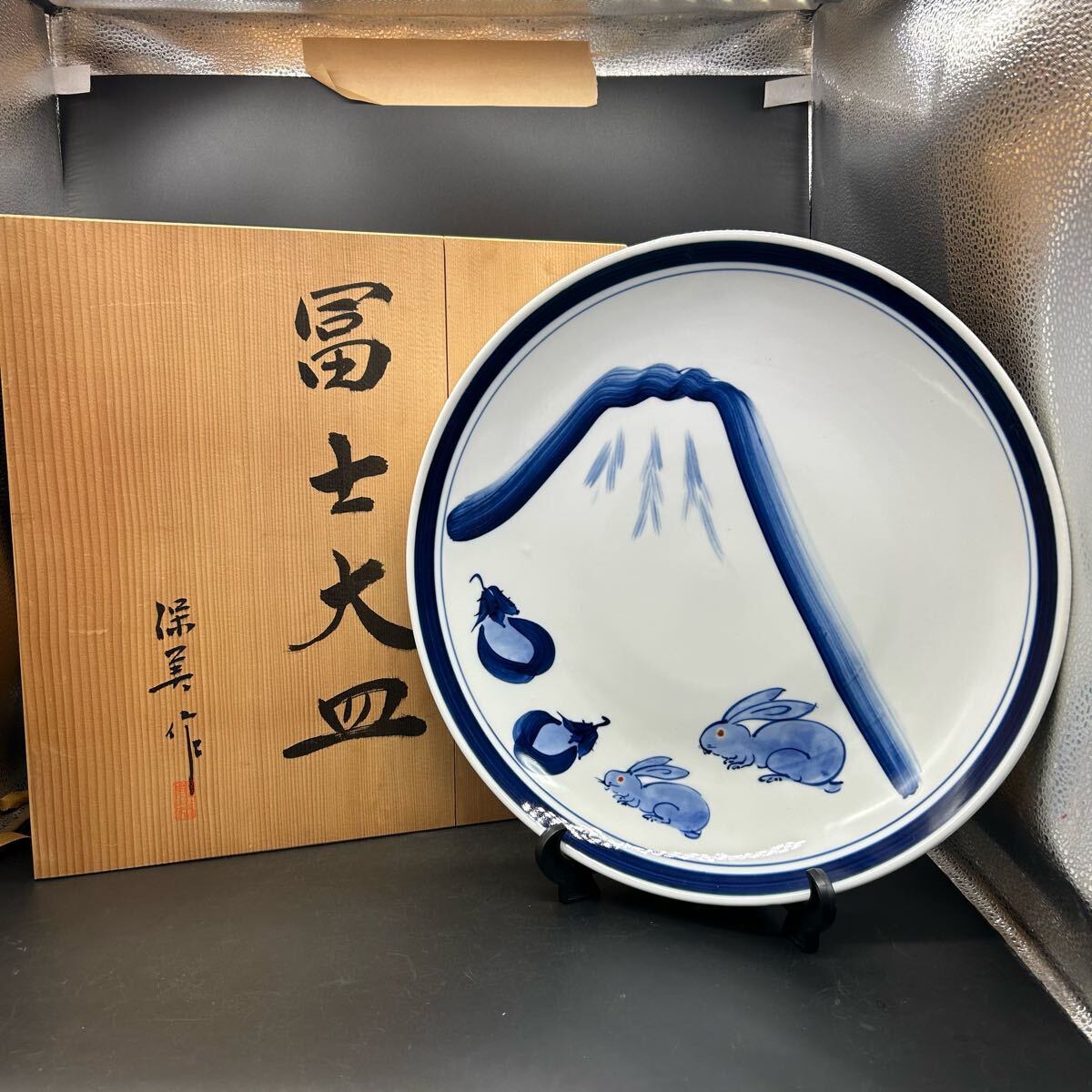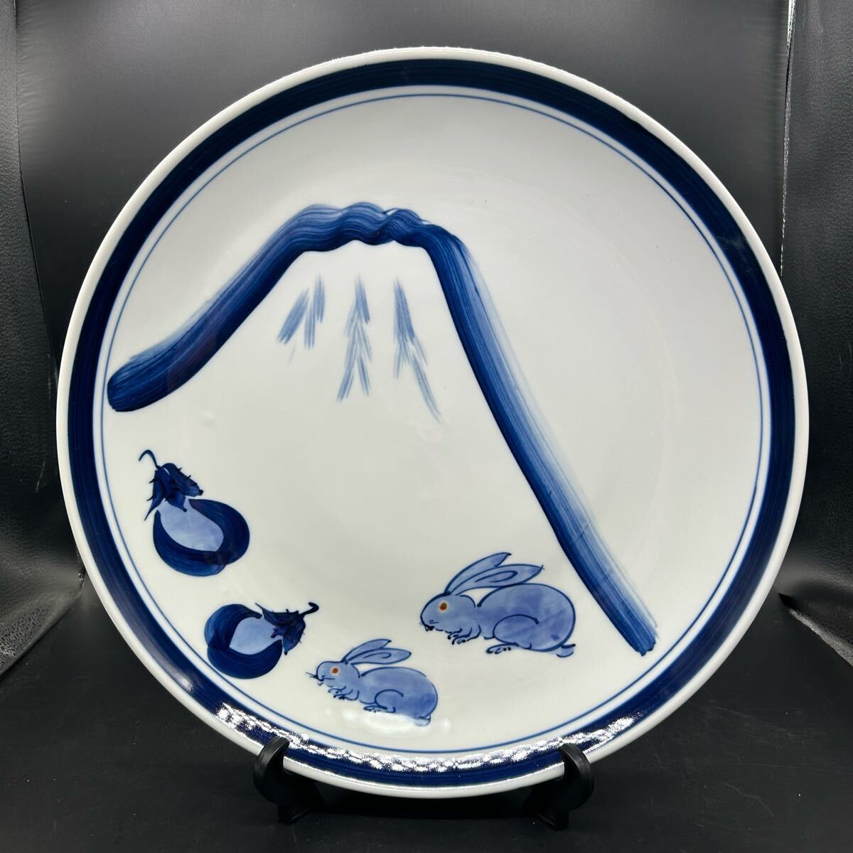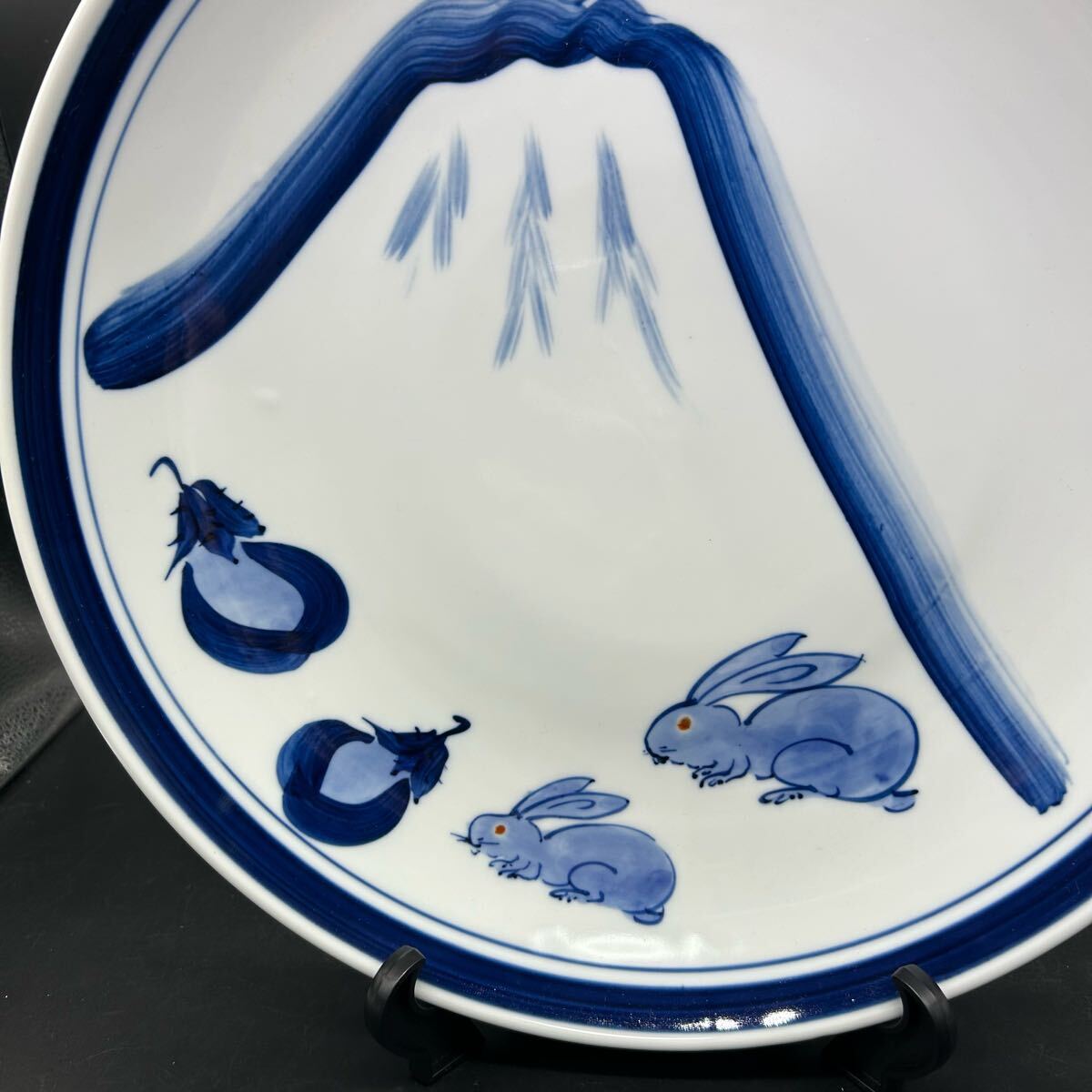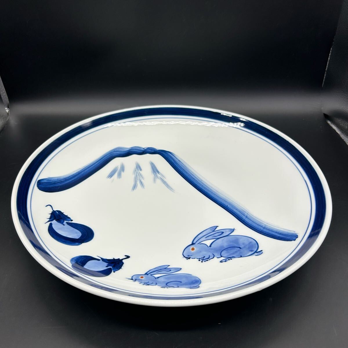 富士大皿 保美 富士山 うさぎ ナス 大皿 飾皿 絵皿 染付 陶器 ヨ23