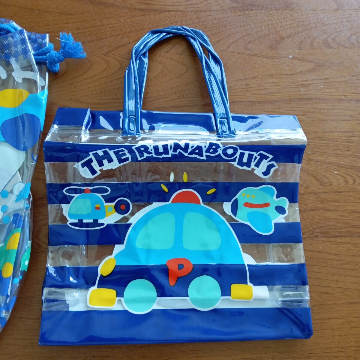 ザ ラナバウツのポーチ、プールバッグ、ハンカチ、色鉛筆、ご飯茶碗、鉛筆のセットです。