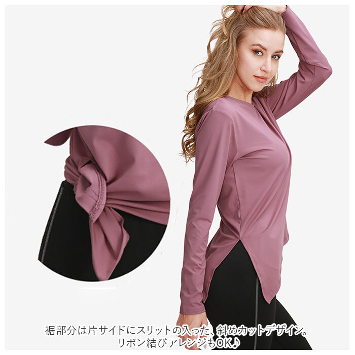 | 商品説明 | ・・シンプルで着こなしやすい、長袖タイプのヨガトップス。 ・首元が詰まり過ぎないクルーネックタイプ。 ・滑らかでサラッとした肌触り。 ・伸縮性もばっちりで動きやすいのがポイント。 ・速乾性があり、洗ってもすぐに乾くのが嬉しい! ・裾部分は片サイドにスリットの入った、斜めカットデザイン。リボン結びアレンジもOK♪ ・ヨガはもちろん、ジムなどでのトレーニングウェアとして活躍! |