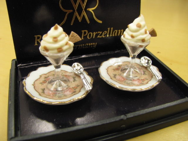 ドイツロイター社製のミニチュアです。グラスに入って、陶器のお皿に乗せられて…とんでもなくVIP待遇のアイス様、2個セットです!ワッフルとナッツのトッピングも可愛いですね!アイスの部分は手作りのため、一つ一つ微妙に形が異なりますので、ご了承くださいね!これで今日のデザートは決まりですね!お皿の直径約20ミリ、全体の高さ約24ミリ。※スプーンは接着されています。スケールは1/12です。アクリルケース入りです。アクリルケースからは取り出せます。
