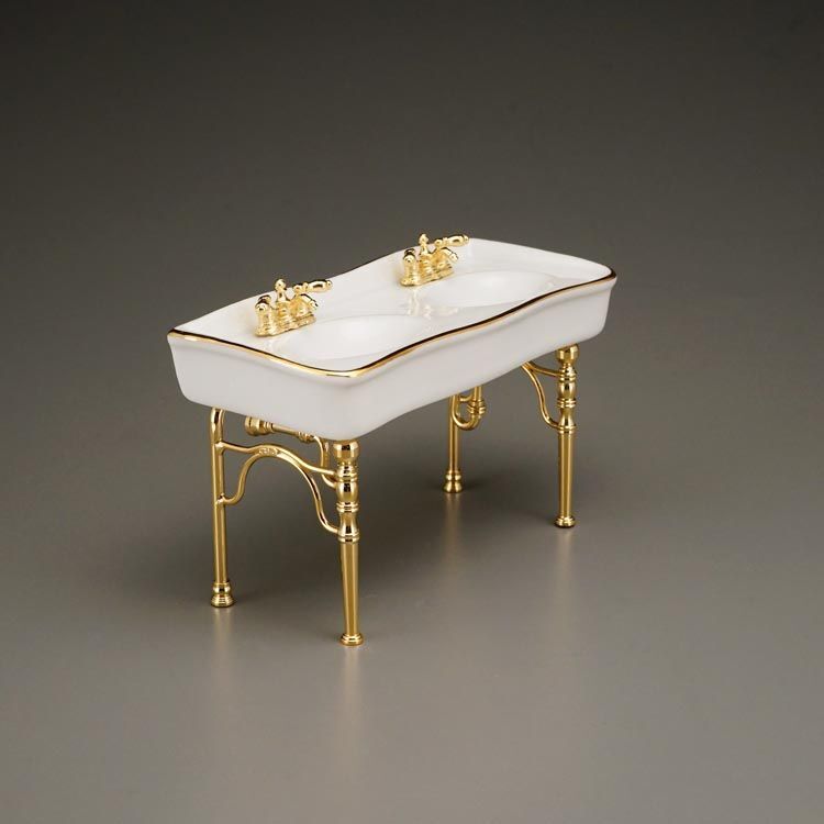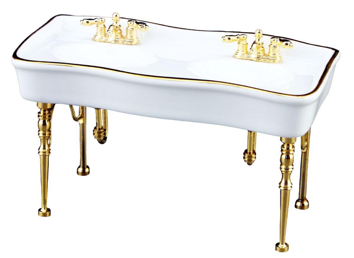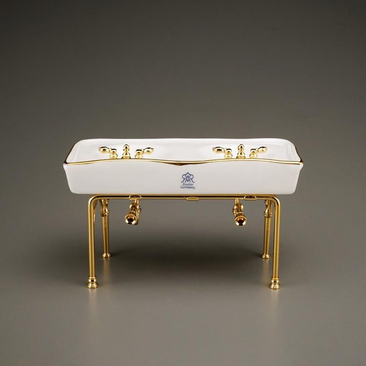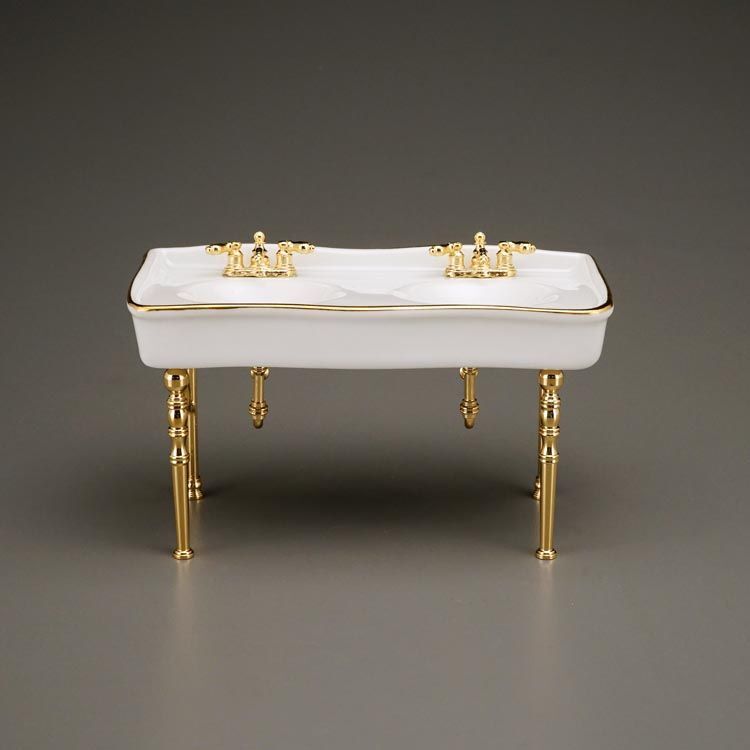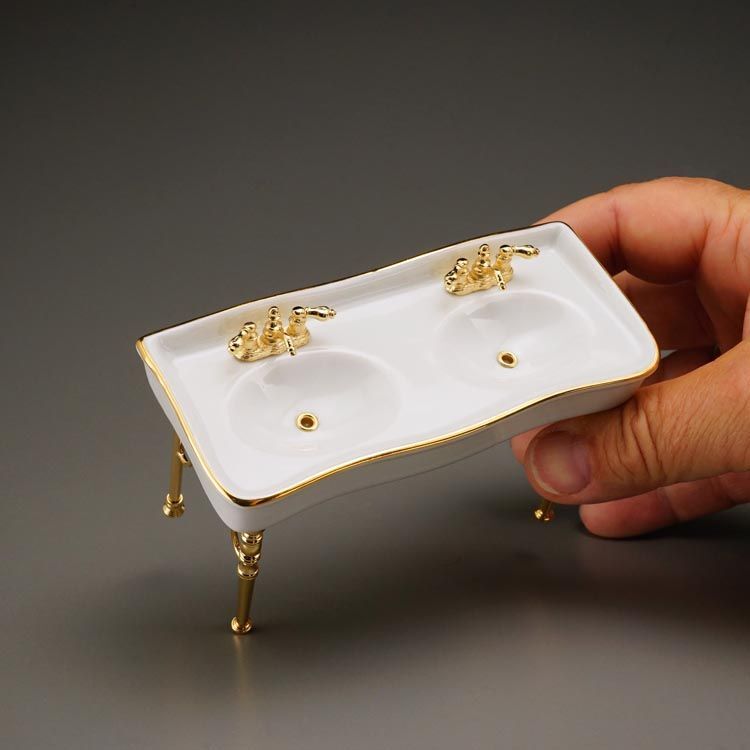 ドイツロイター社製のミニチュアです。スケールは1/12です。日本の一般家庭ではあまり見かけないゴージャスな洗面台ですね!ホテルライクな、ゴージャスなドールハウスに、ぜひいかがでしょうか?※写真では足の部分が暗いお色に見えますが、実物は鮮やかで明るい金色です。サイズ:W115xD50xH62ミリ。