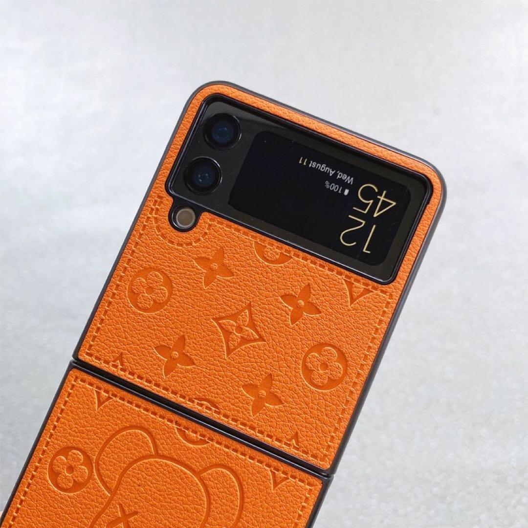 Galaxy Z Flip3 ケース 合皮レザーケース オレンジ ロゴ 可愛い熊 BEAR おしゃれ スクリーン保護 高級感 軽量 ギャラクシーZ フリップ 3