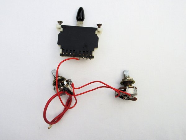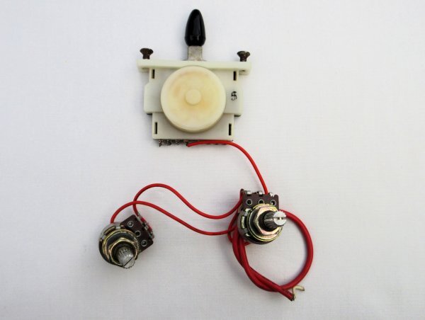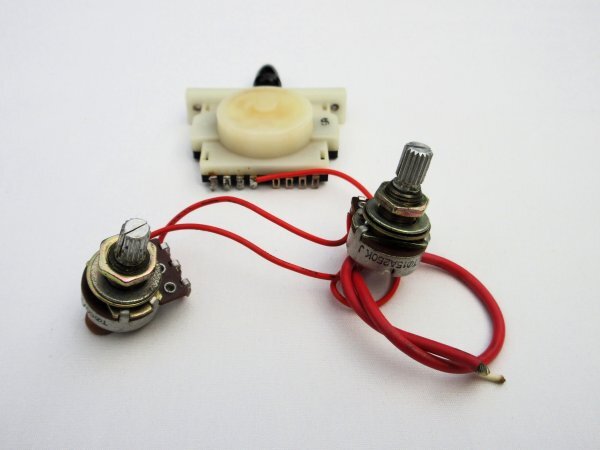 セット内容はボリュームがA250kΩ、トーンはZ250kΩ、VLX53型5点式スイッチに形状が似ている5点式スイッチです。