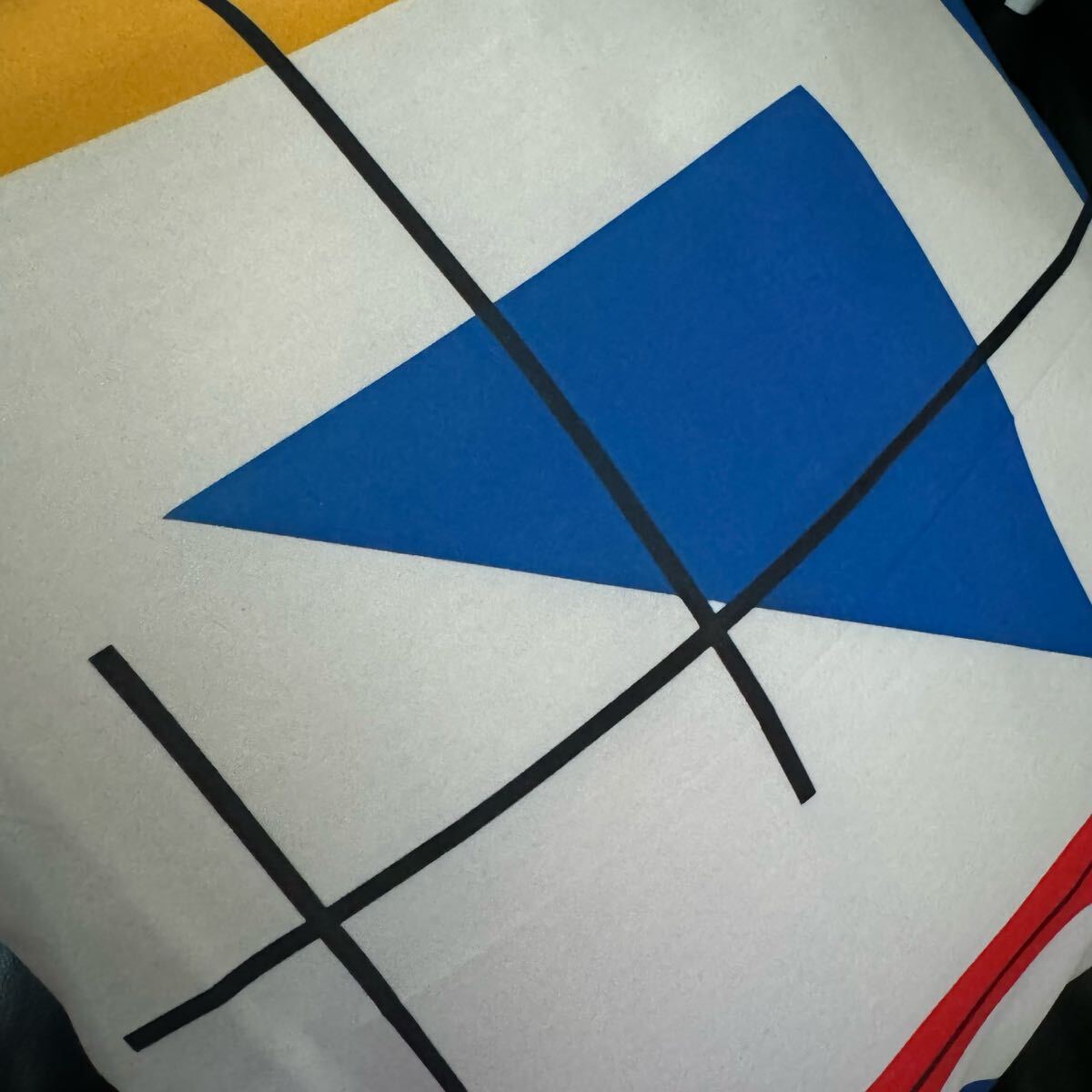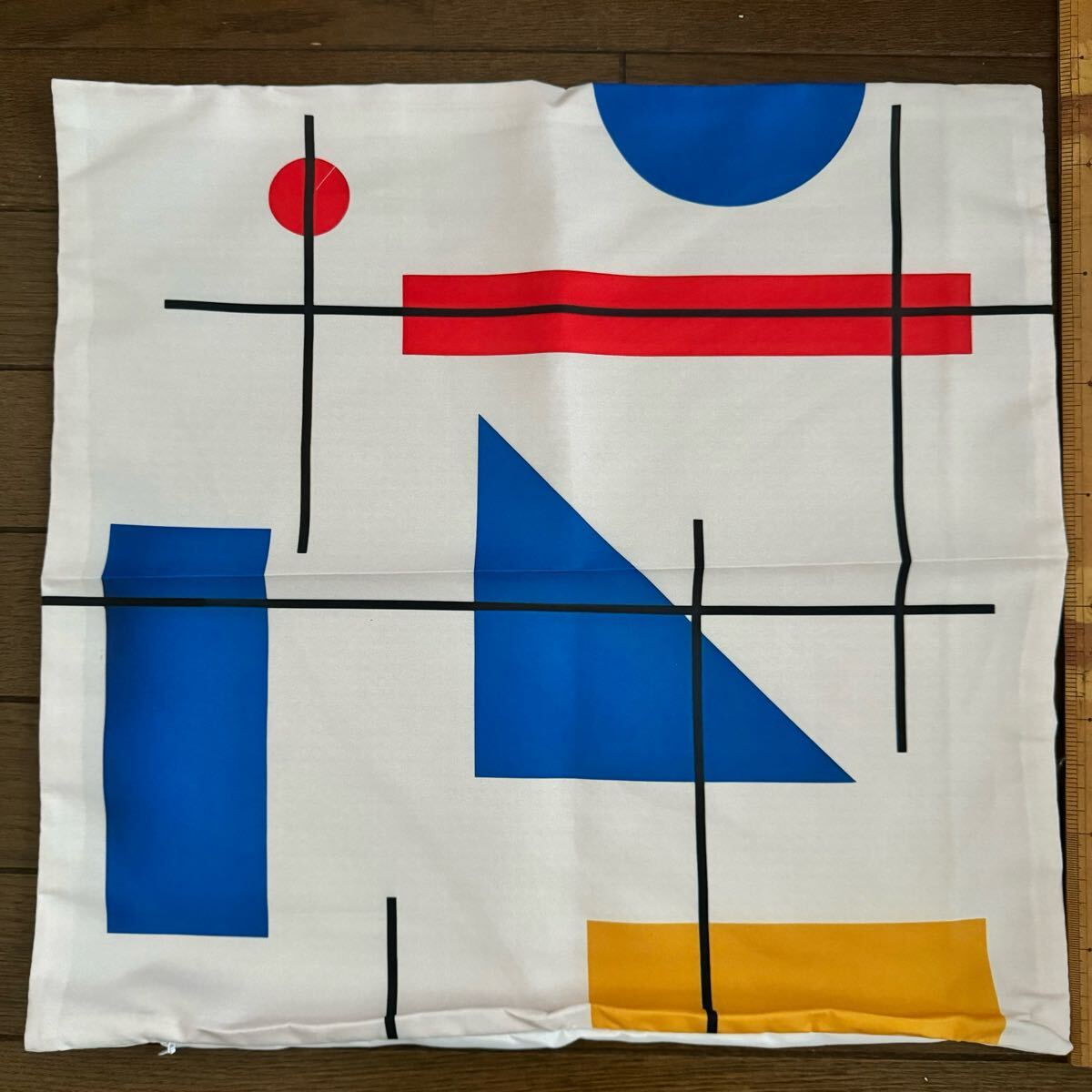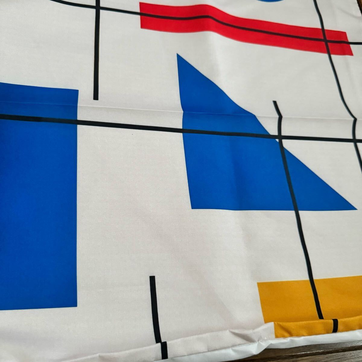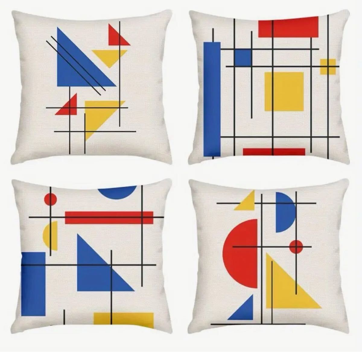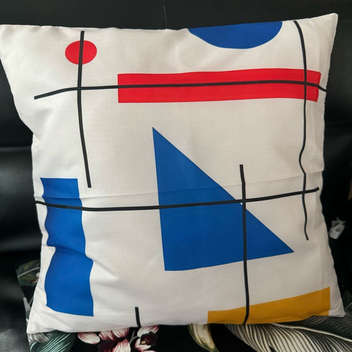 部屋の印象も変わるオシャレでレトロなミッドセンチュリー幾何学モンドリアン風柄のクッションカバーです。