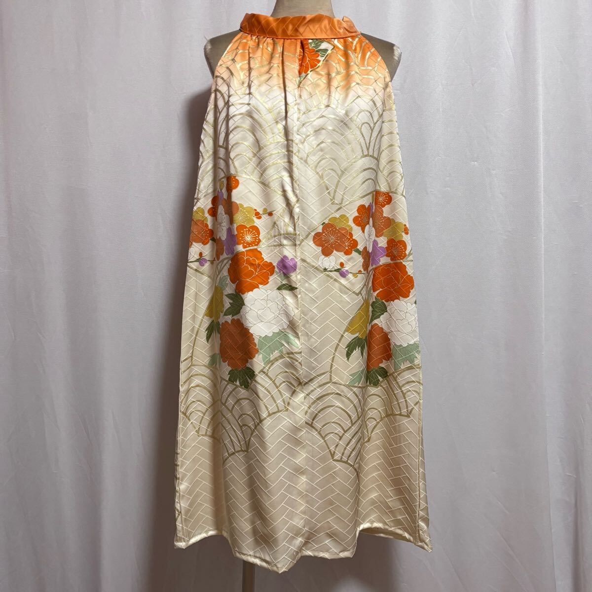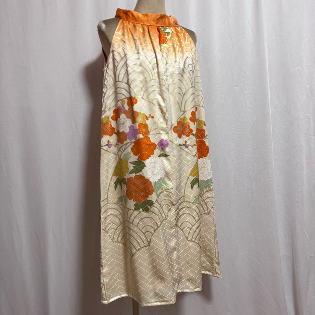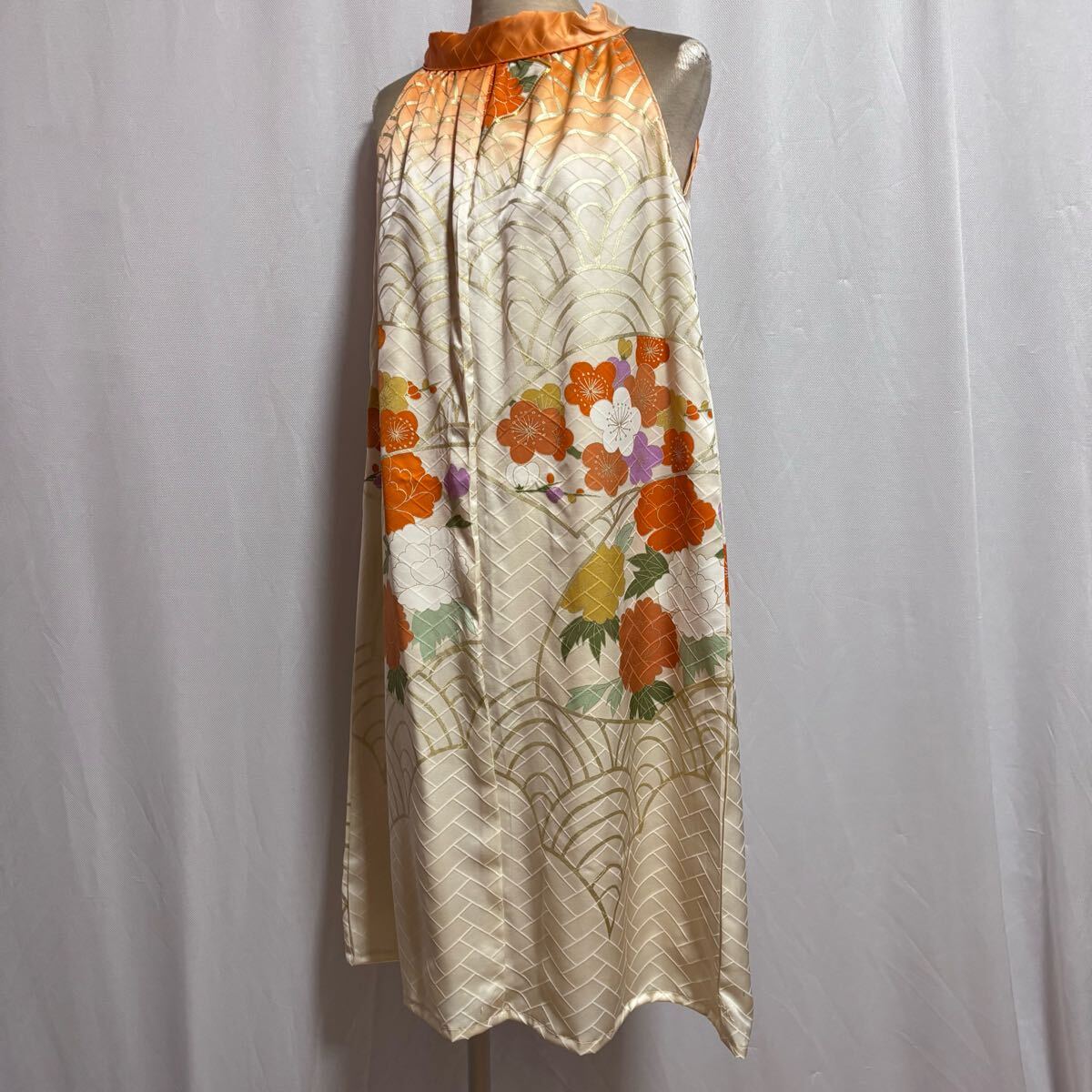★169★生成色オレンジ振袖ホルターネックワンピース★暈し波牡丹梅★M★