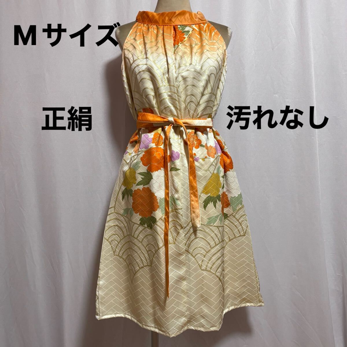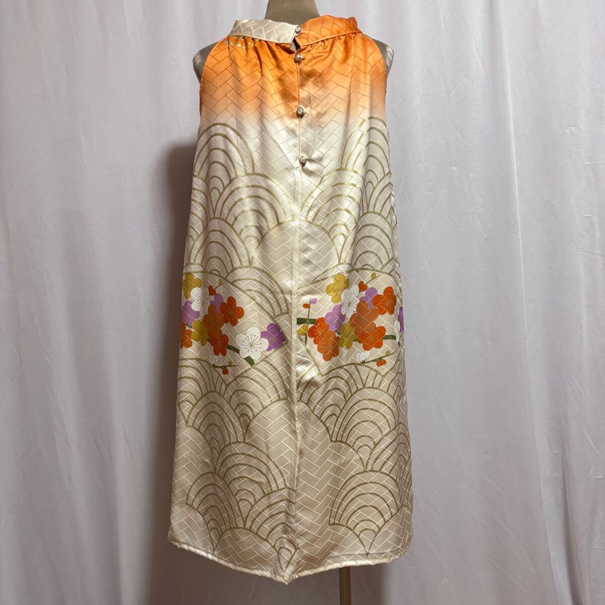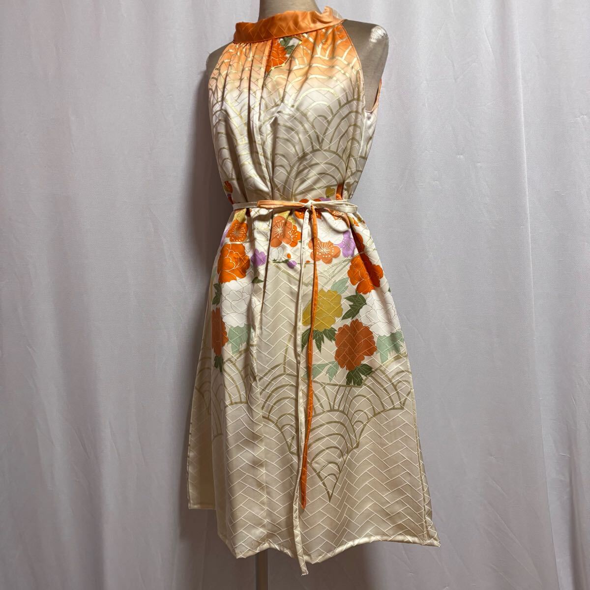 ★169★生成色オレンジ振袖ホルターネックワンピース★暈し波牡丹梅★M★