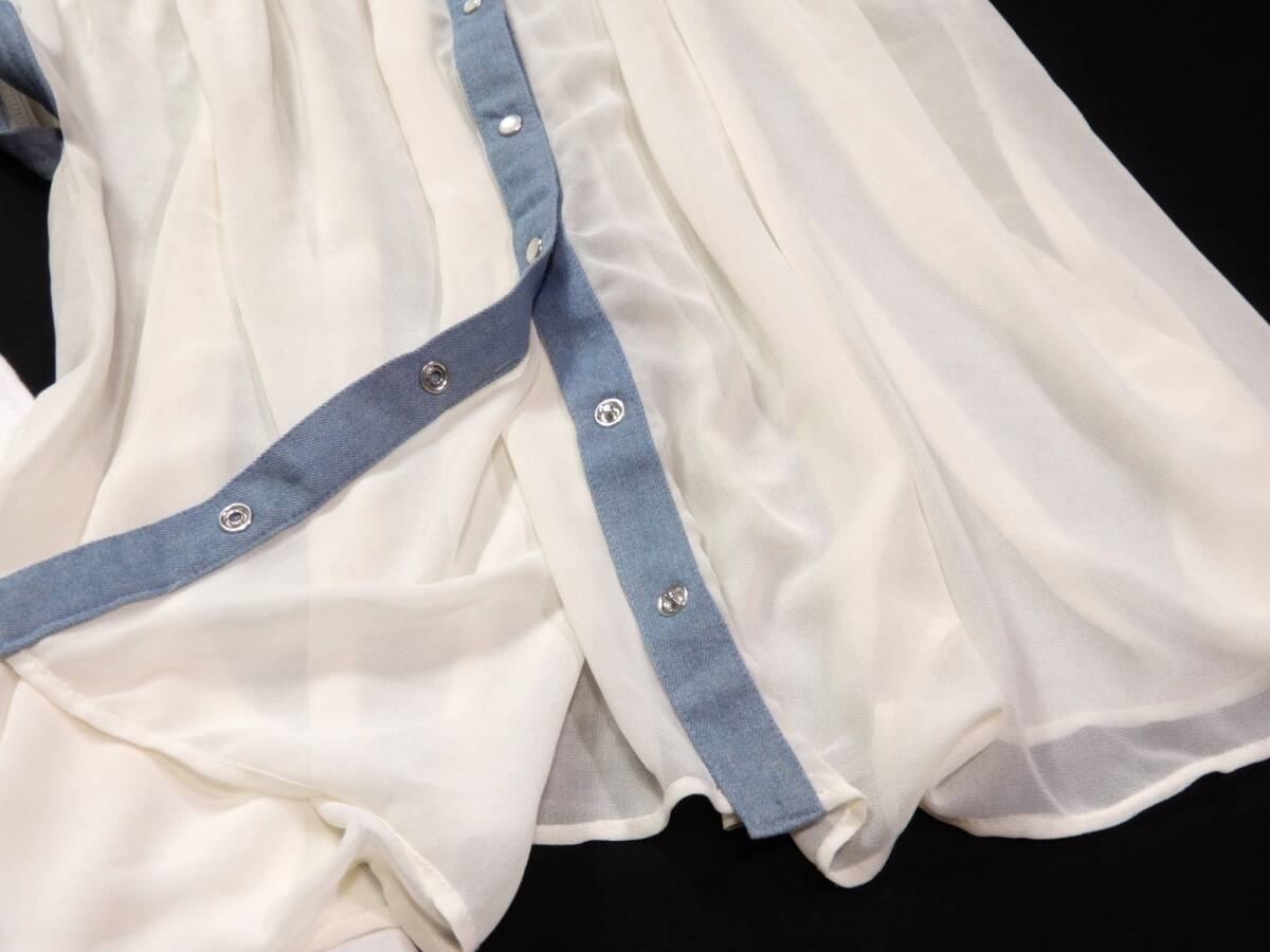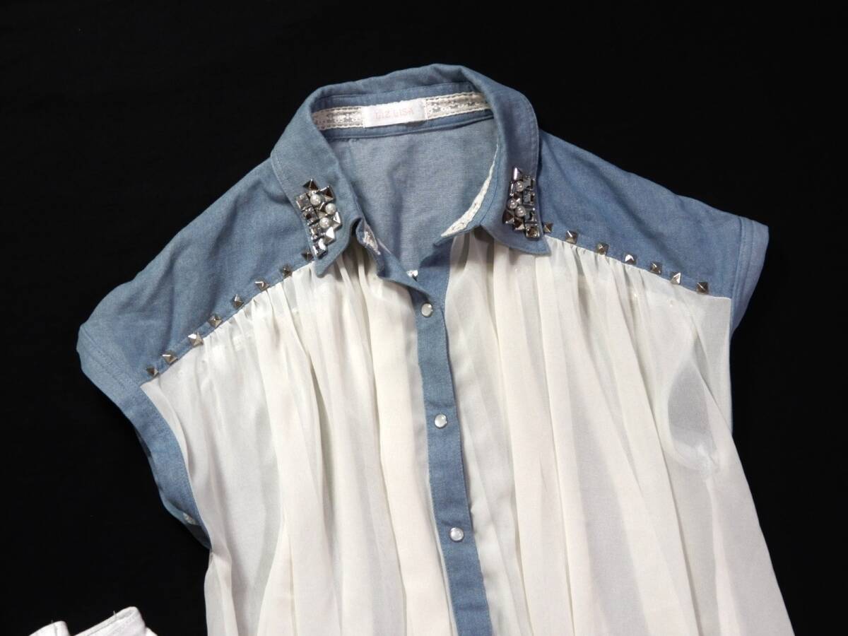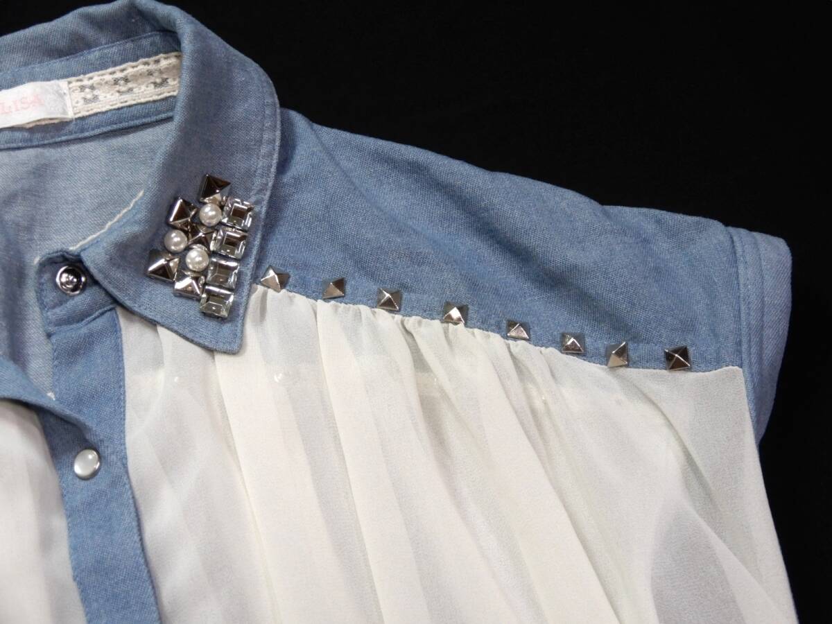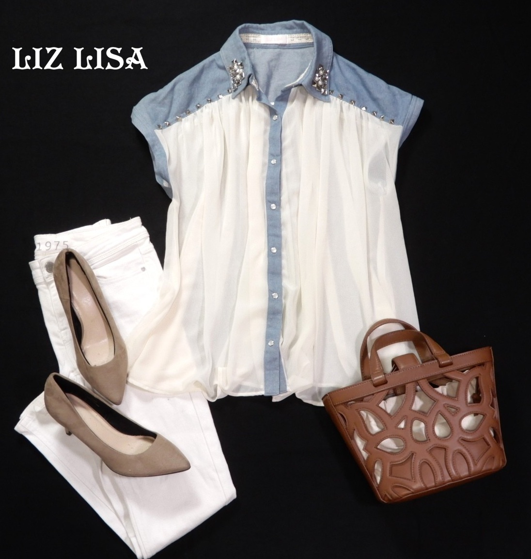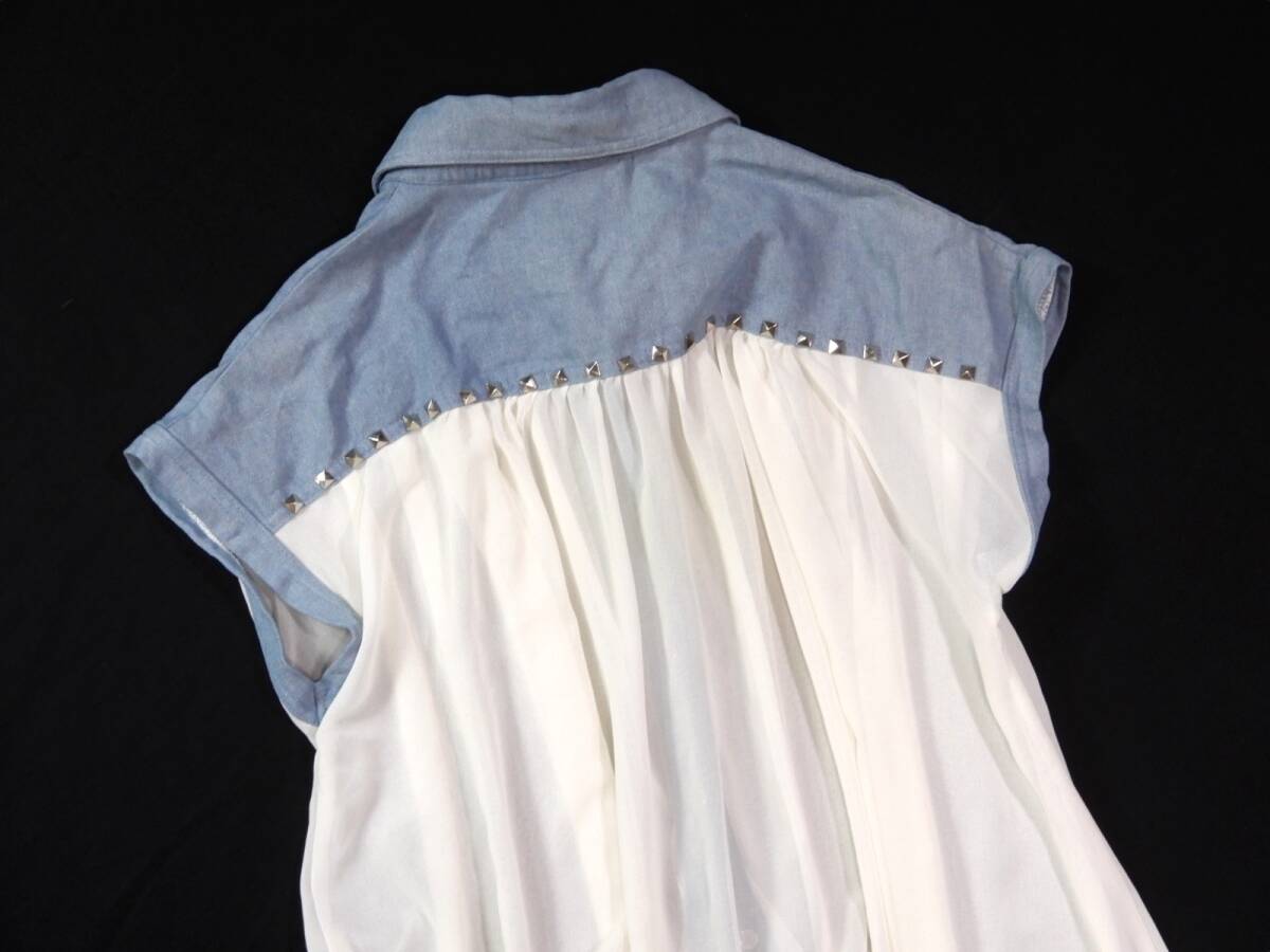 リズリサ LIZLISA 大人可愛い☆ スタッズ 異素材切り替え デニム シフォン シアー ギャザー デザイン シャツ