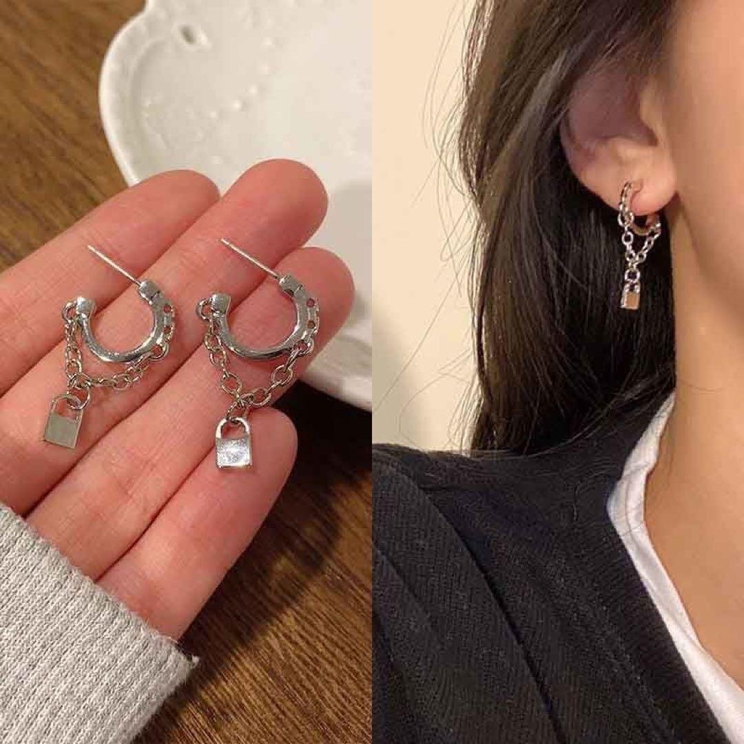 フープピアスにチェーンと鍵のモチーフが組み合わさった、個性的で目を引くデザインです。