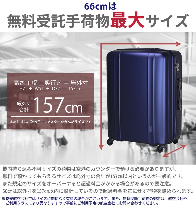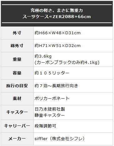 進化を遂げた軽量ボディ 心も足取りも軽くするスーツケース≪ZEROGRA2/ゼログラツー≫ 驚きの軽さと快適性をぜひ体感して下さい。 ![]() ![]() ![]() ![]() ~超軽量 スーツケース ZEROGRA~ *カラー:マットネイビー *サイズ:約H66(71)×W48(51)×D31(32)cm ( )はキャスター・取っ手込み総外寸 *重量: 約3.6Kg *容量: 約105L(約7泊-長期旅行向き) *素材: ポリカーボネート *キャスター:静音キャスター(日乃本錠前社製) *メーカー:siffler(株式会社シフレ) *定価:33000円(税込) *状態:未使用 アウトレット 美品