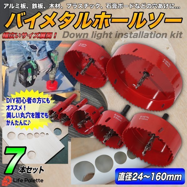 | バイメタル ホールソー ホルソー セット 穴あけ ドリルビット 切削 掘削 工具 木工 鉄工 キリ 電動ドリル DIY 24 30 50 65 100 110 160mm DJ567 新品 全国送料無料 バイメタルホールソー アルミ板、鉄板、木材、プラスチック、石膏ボードなどの穴あけに 使用頻度の高いものを厳選! お得なバイメタルホールソー7点セットです。 アルミ板、鉄板、木材、プラスチック、石膏ボードなどの穴あけにお使いいただけます。 センタードリル、スプリング付きで掘削などにも適しています。 薄刃設計により切削抵抗が少なく、速い穴あけが可能です。 セット内容【バイメタルホールソー 7本】 ヘッド直径24~160mm 7本セット 24mm 30mm 50mm 65mm 100mm 110mm 160mm 材質:HSS センタードリル スプリング付き 軸形:写真参照 (3本爪チャック式用 6.35ミリ六角軸には使用不可) 適用機器:回転専用ドリル、ボール盤 電動ドリル等 (チャック10mm~13mm汎用型) 適用材質:アルミ板(3mm以下)、鉄板(3mm以下)、木材、プラスチック、石膏ボード等 【ホールソー使用動画】 ホールソーセット続々出品中♪ 【使用上の注意】 部材に対し垂直に使用してください。途中からドリルを傾けたりしないで下さい。 作業時はゴーグルやマスク等の保護具を装着してください。 作業時はホールソー本体が熱を持っており、火傷の恐れがありますので素手で触らないようにしてください。 | |||