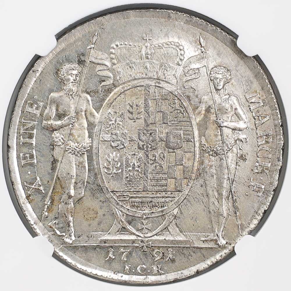 ドイツ小侯国時代の希少な大型銀貨として、歴史的価値・芸術性・保存状態の三拍子が揃った逸品です。