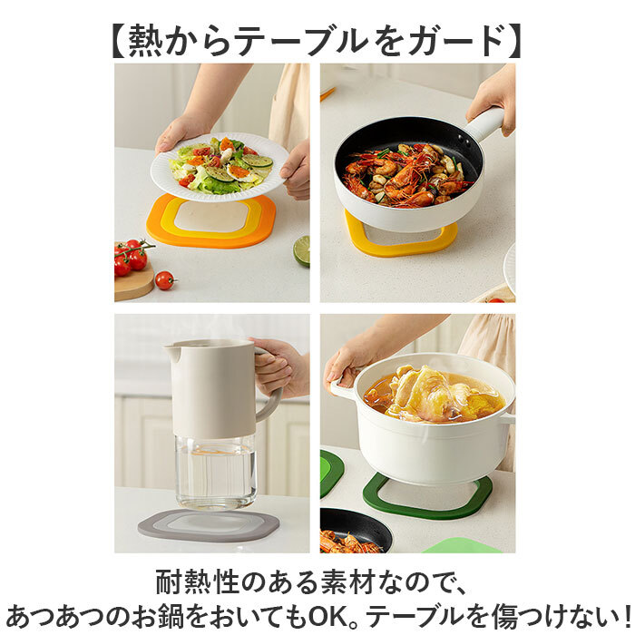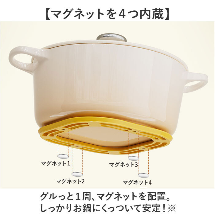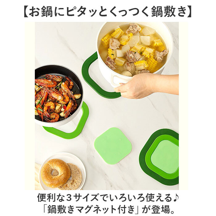 商品説明 | ・・【お鍋にピタッとくっつく鍋敷き】 ・便利な3サイズでいろいろ使える♪「鍋敷き マグネット付き」が登場。 ・【ひと手間を無くす、便利アイテム】 ・鍋敷きとお鍋をピタッと一体化◎キッチンとテーブルの往復を減らせる、アイディア品。 ・【マグネットを4つ内蔵】 ・グルっと1周、マグネットを配置。しっかりお鍋にくっついて安定! ・※鍋敷きをつけたまま、火にかけないようご注意ください。 ・【熱からテーブルをガード】 ・耐熱性のある素材なので、あつあつのお鍋をおいてもOK。テーブルを傷つけない! ・【やわらかシリコンで長持ち】 ・変形、劣化しにくいシリコン素材を採用。耐久性が高いから長く愛用できる。 ・【食洗機OK◎イージーケア】 ・毎日洗いも楽ちんな、イージーケアが嬉しいポイント。サッと水洗いも。 ・【どこいった?がなくなる◎】 ・冷蔵庫にそのまま貼って保管もOK!マグネットみたいな使い方もできる。 |