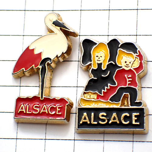 "ピンバッジ・アルザス地方のコウノトリ鳥と民族衣装の女の子男の子"の商品説明 | |