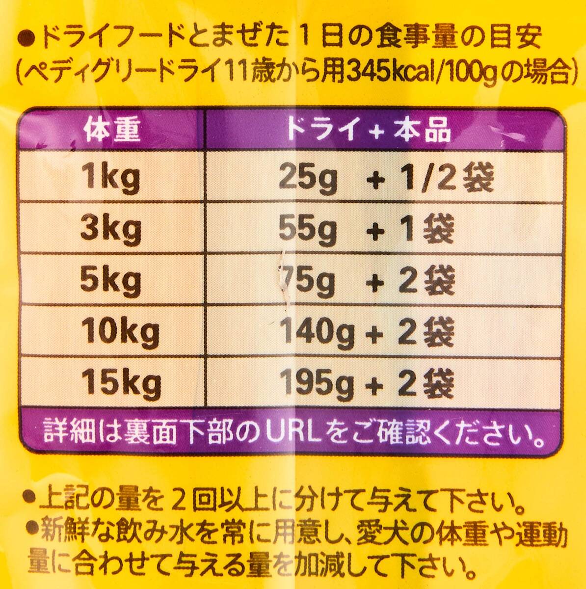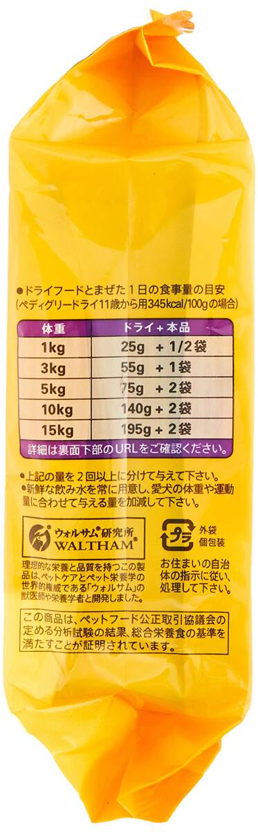 説明商品紹介14歳頃からの愛犬に必要な栄養がバランス良くとれる総合栄養食です。愛犬が大好きなささみに、ビタミン豊富な緑黄色野菜を加えました。原材料・成分肉類(チキン、ささみ、ビーフ)、野菜類(にんじん、かぼちゃ)、植物性タンパク、食物繊維、植物性油脂、グルコサミン、ビタミン類(B1、B2、B6、B12、C、E、K、コリン、ナイアシン、パントテン酸、ビオチン、葉酸)、ミネラル類(Ca、Cl、Fe、I、K、Mg、Mn、Na、P、Zn)、アミノ酸類(タウリン、メチオニン)、増粘安定剤(加工でん粉)、増粘多糖類、着色料(二酸化チタン)、ポリリン酸Na、EDTA-Ca・Na使用方法ドライフードとまぜた1日の食事量の目安("ペディグリー"ドライ11歳から用345kcal/100gの場合)体重1kg:ドライ25g+1/2袋、 3kg:ドライ55g+1袋、 5kg:ドライ75g+2袋、 10kg:ドライ140g+2袋、 15kg:ドライ195g+2袋 ■ご注文からお届けまで ※トラブル防止のため入札、落札前に必ずご一読をお願い致します。 落札後のお客様都合でのキャンセルはお受けできませんので、予めご了承ください。 1.ご注文 : ご注文は24時間受け付けております。 2.注文確認 : ご注文時、オーダーフォーム等必要事項を入力お願い致します。 3.入金確認 : 前払い決済をご選択の場合、ご入金確認後、配送手配を致します。 4.出荷 : 配送準備が整い次第、出荷致します。配送業者、追跡番号等の詳細をご連絡致します。 5.到着 : 出荷後、1-3日で商品が到着します。 ※商品の到着までは、決済確認後、3-7営業日でお届けとなります。 ※離島、北海道、九州、沖縄は遅れる場合がございます。ご了承下さい。 ※代引の場合、手数料として660円頂きます。 商品管理、在庫管理は行っておりますが、商品の不具合等でお届け出来ない場合は、 銀行口座へ振込返金となりますので、予めご了承いただきますようお願い申し上げます。 手続き削減の為、こちらからは発送完了までご連絡を行なっておりません。 原則、電話対応はしておりませんので、ご質問等はお問い合わせ、またはメールにてお願い致します。 土日祝祭日はご質問や落札されても商品発送等の、対応ができない日もございます。 予めご了承ください。 | ||