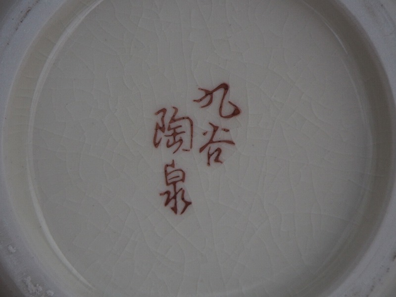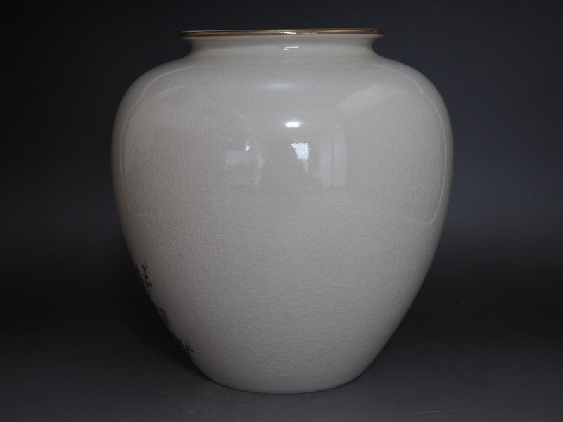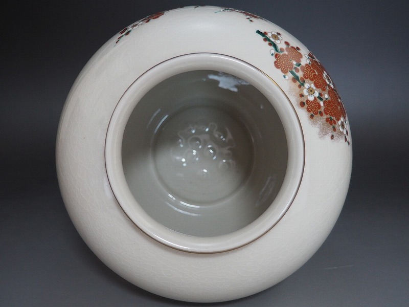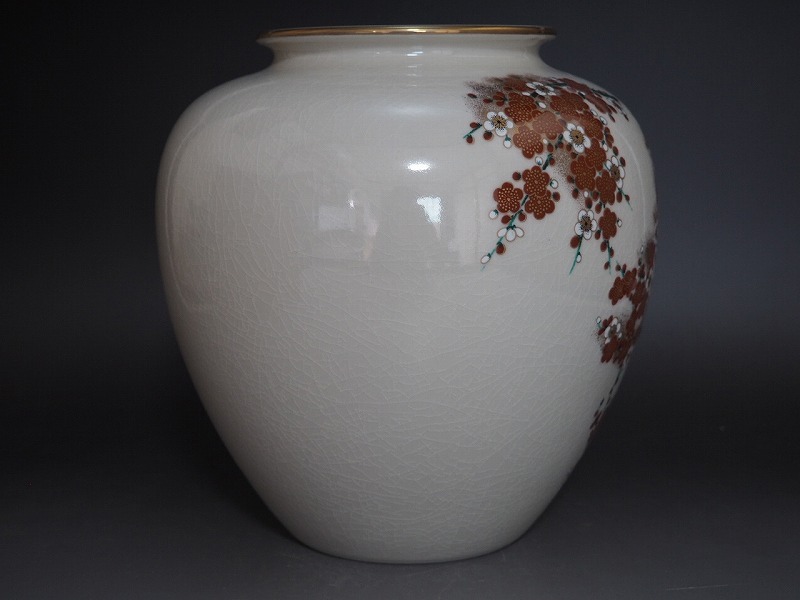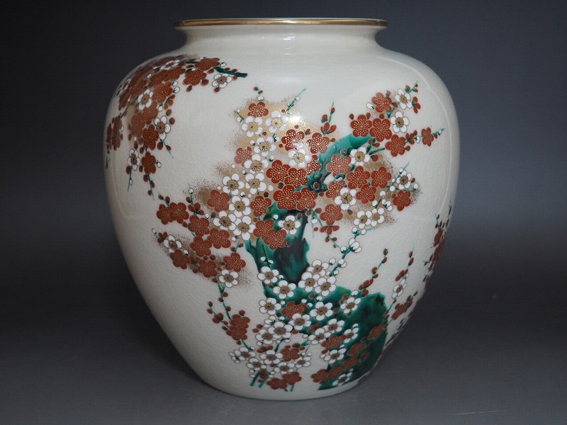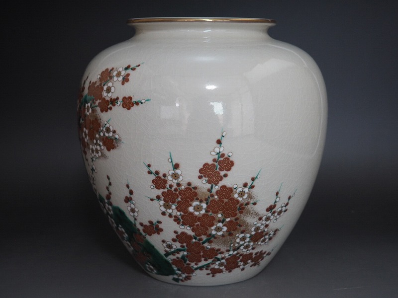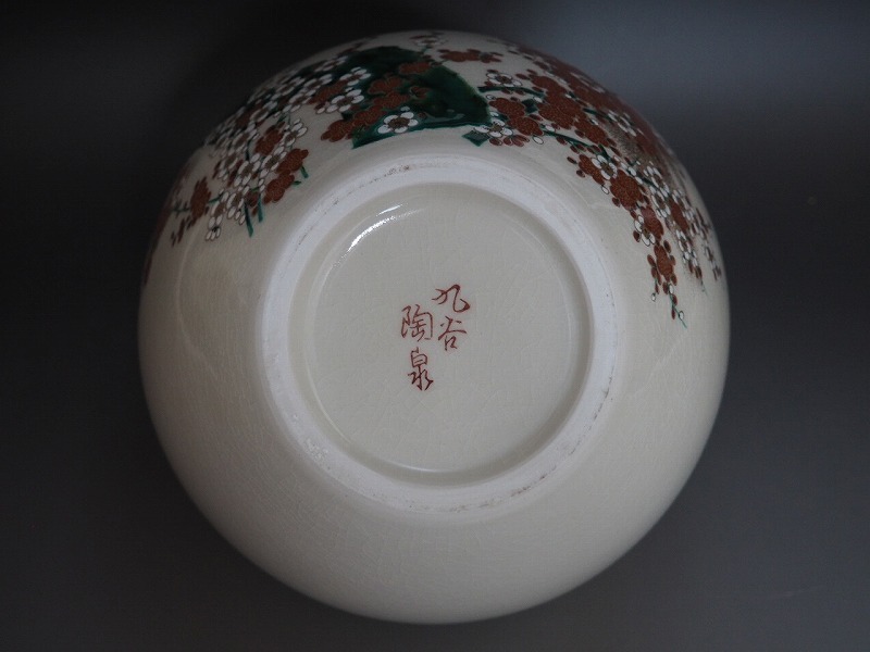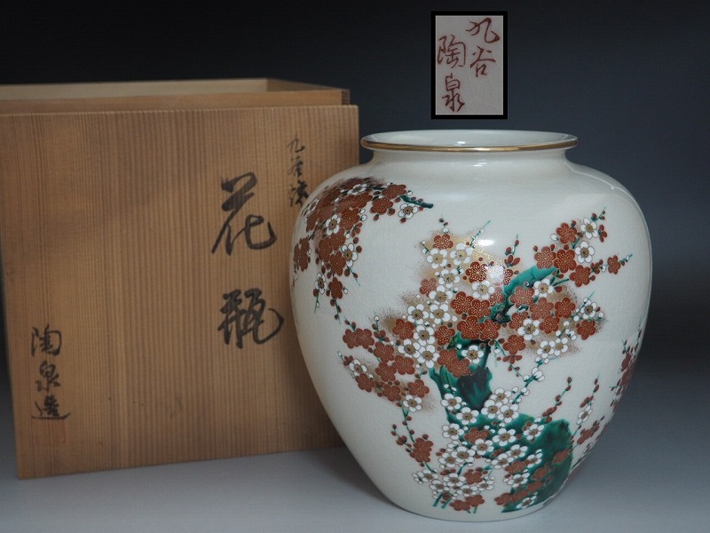 C0601 九谷焼 陶泉 造 紅白梅文 花瓶 共箱付 ☆ 花道具 華道具 茶道具 花器 花入 花生 飾壷 飾壺 陶器 作家物 在銘 陶印 美品 良品 無傷 | ||