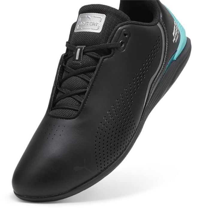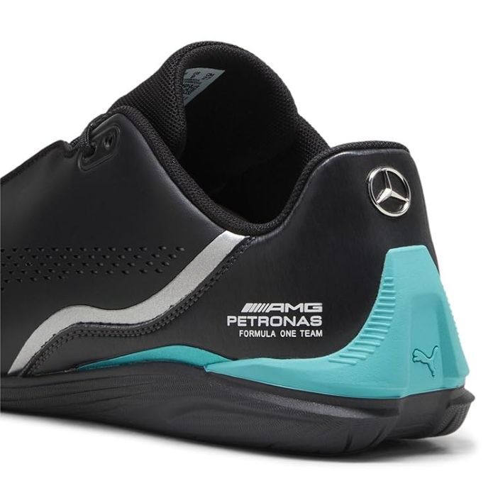 すっきりと洗練されたシルエット、メルセデスAMGペトロナスのブランディングロゴが目を引く一足。