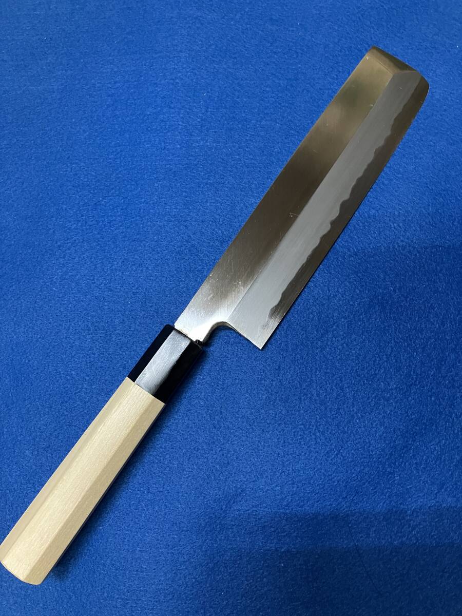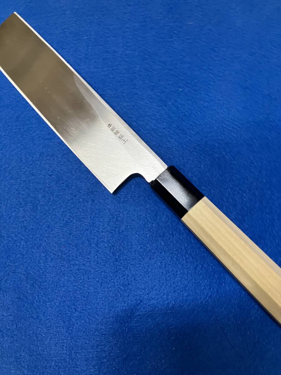 堺鍛造安来白二、角薄刃包丁、朴八角柄入り、刃渡り185mm、背厚4mm、重さ220g、(化粧箱入り)
