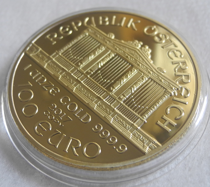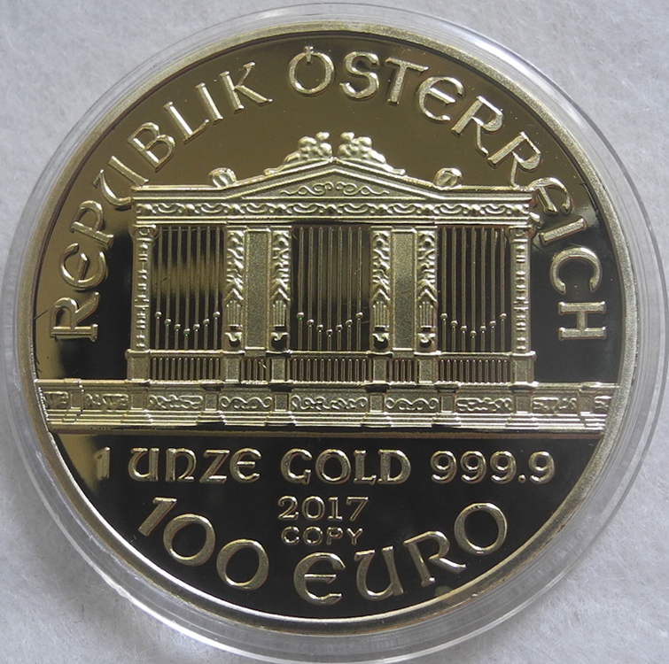 オーストリア、ウィーンフィル100ユーロ金貨の24金メッキレプリカコインです。ケース付き。