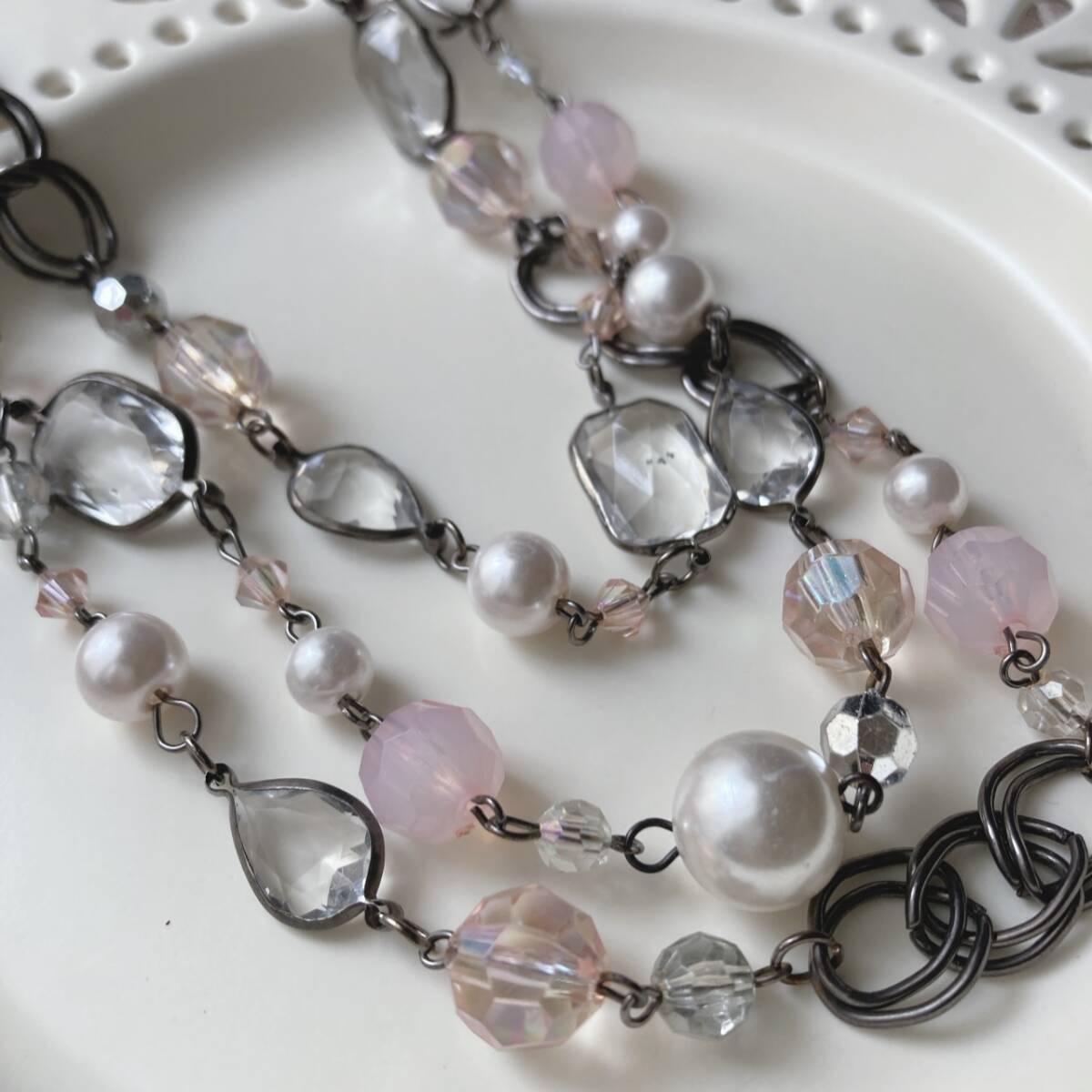 ネックレス ロング チェーン パール 大ぶりビジュー ピンク クリスタル キラキラ 美品☆vintage jewelry accessories R0828