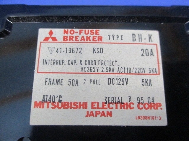 ノーヒューズブレーカ 2P20A(ジャンク品) 三菱電機 BH-K
