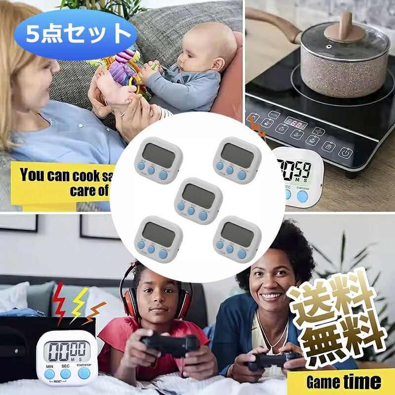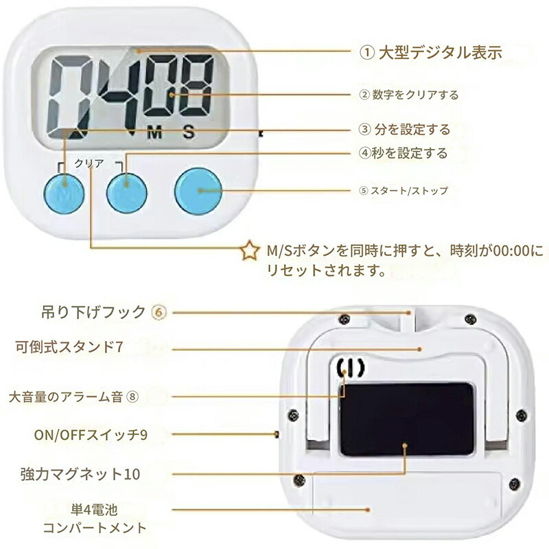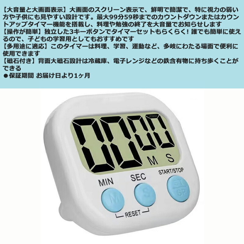 【大音量と大画面表示】:大画面のスクリーン表示で、鮮明で簡潔で、特に視力の弱い方や子供にも見やすい設計です。最大99分59秒までのカウントダウンまたはカウントアップタイマー機能を搭載し、料理や勉強の終了を大音量でお知らせします