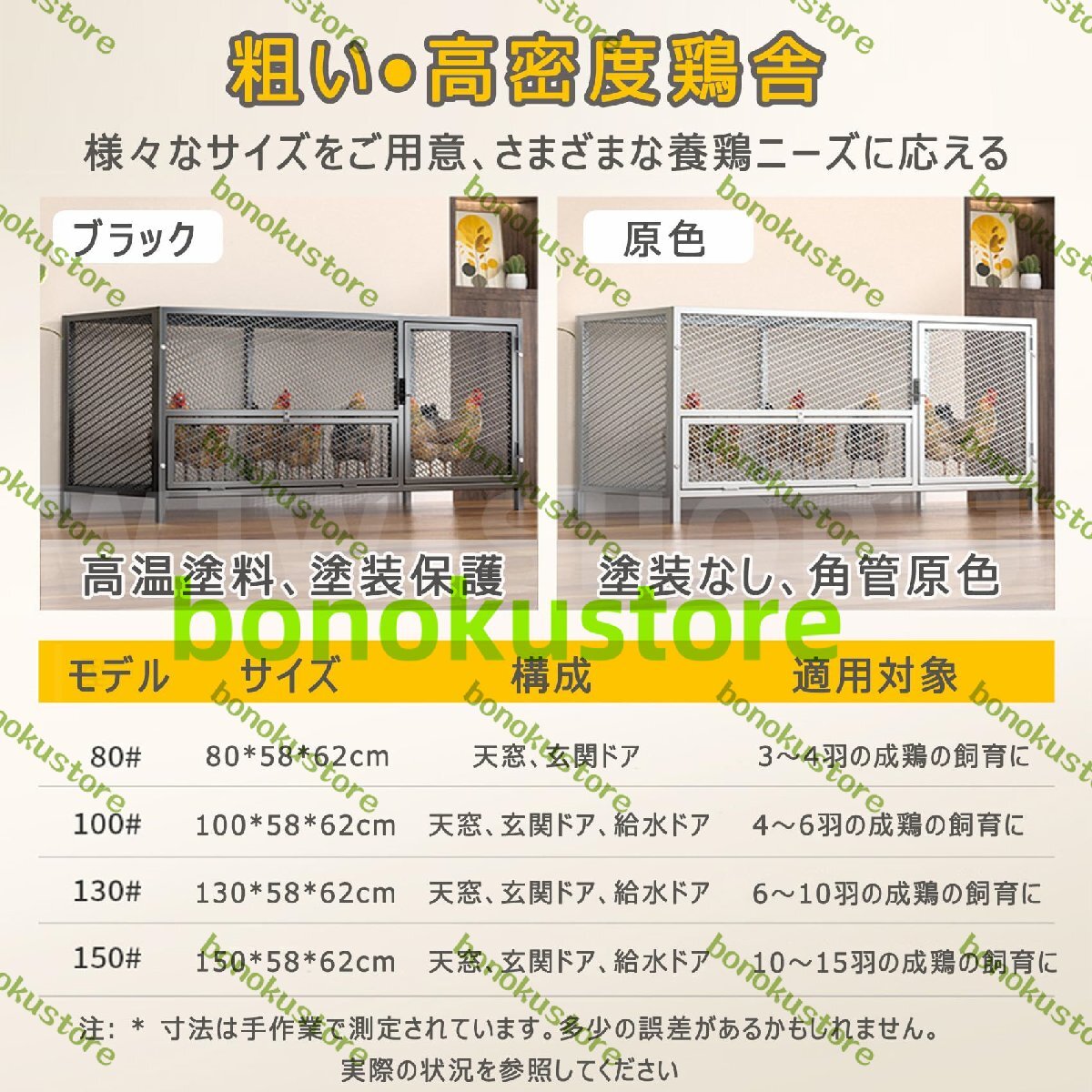 【様々なニーズに合わせた複数のサイズ】80#(80×58×62cm)、100#(100×58×62cm)、130#(130×58×62cm)、150#(150×58×62cm)など、さまざまな仕様があり、それぞれ3?4羽、4?6羽、6?10羽、10?15羽の成鶏の飼育に対応でき、さまざまな養鶏ニーズに簡単に対応できます。