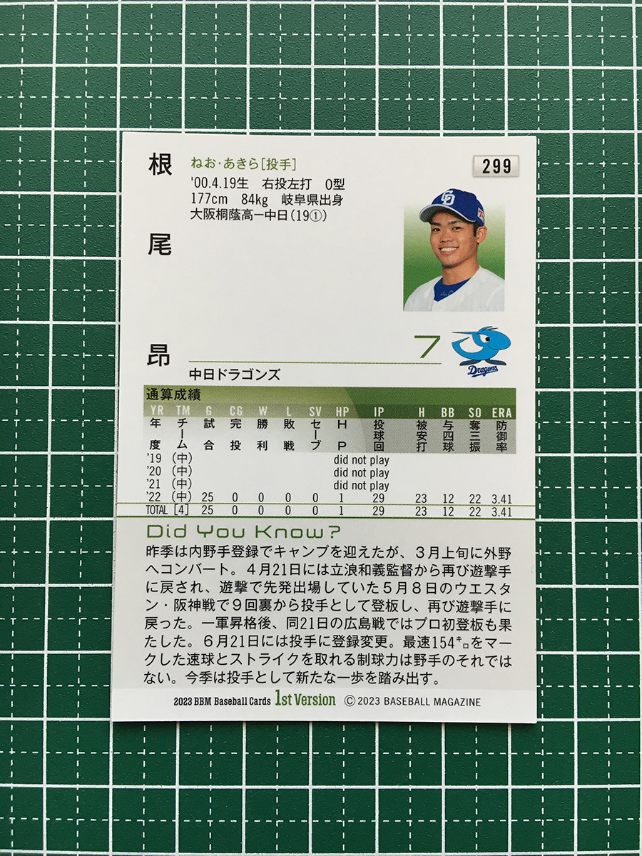 ★BBM 2023 1st バージョン #299 根尾昂[中日ドラゴンズ]レギュラーカード★