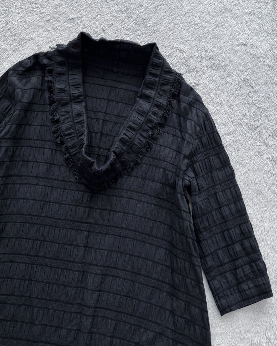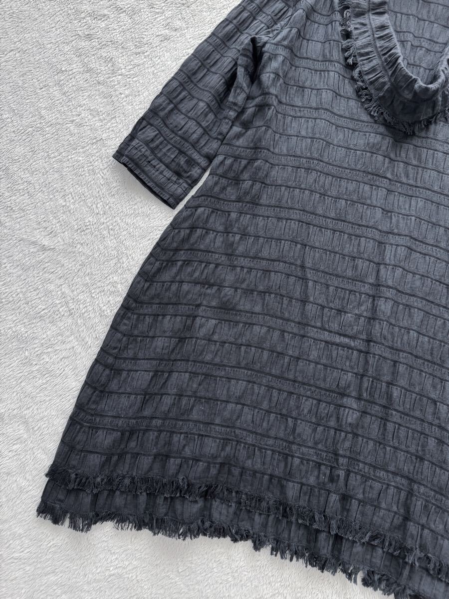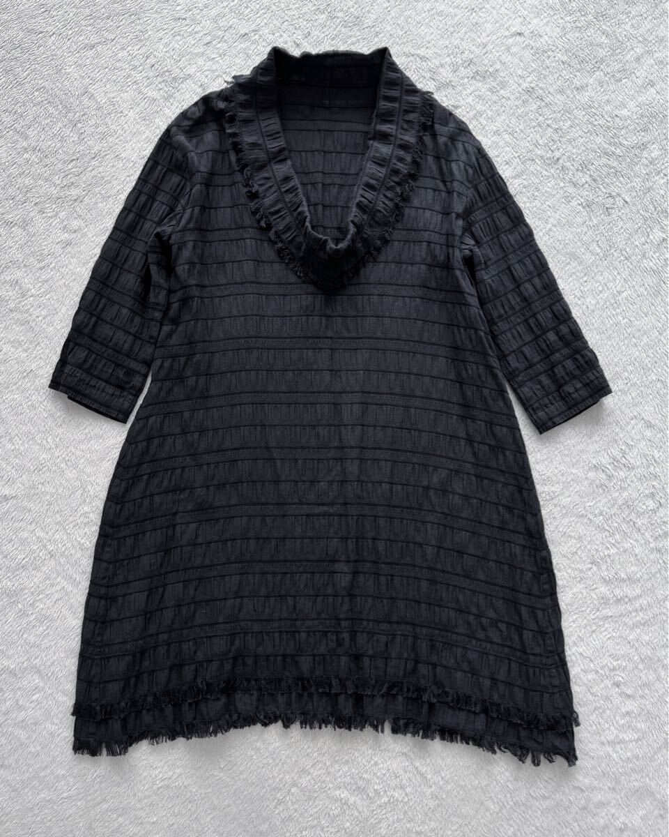 ・立体的で表情のある生地を使用しゆったりとボリュームを持たせたネックに裾に向かって広がった身頃や手首が見える絶妙な袖丈など計算されたモダンなシルエットがとてもお洒落なチュニックになります♪