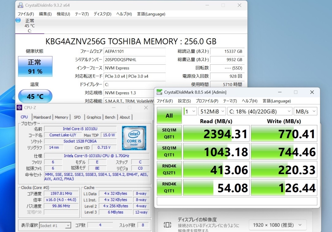 | CPU: 超高速 Intel 超高性能 第10世代Core i5-10310U 1.7Ghz、 4コア8スレッド (ターボ・ブースト利用時の最大周波数 4.4GHz) |