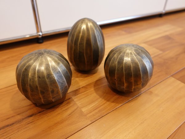 ご覧いただきましてありがとうございます。 高級マンションのモデルルームでディスプレイに使われていた、メーカー不明の金属製の丸いオブジェです。 3個セットでの出品です。 真鍮を削りだしたような質感で、雰囲気のよい製品です。 おそらくアルミのような素材に塗装を施したものと思われます。 サイズは2点がφ10cm×高さ10cm程度、1点がφ10cm×高さ13cm程度です。 コンディションですが、高級マンションのモデルルームで展示利用をされていたもので、とくに目立つ大きなキズや使用感もなく、良好です。 本体側面にわずかなスレや小さな塗装の剥がれがあるほか、1点の底面に少し目立つ塗装はがれがございます。 こちらの出品のほか、モデルルーム展示品のクッションや小物類を多数出品しております。 →こちらから一覧表示ができますので、あわせてご覧ください。 |