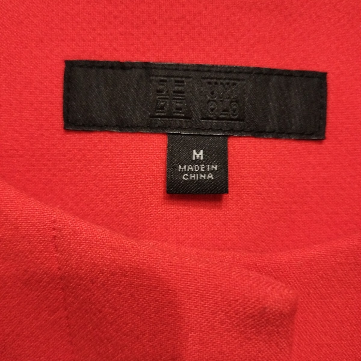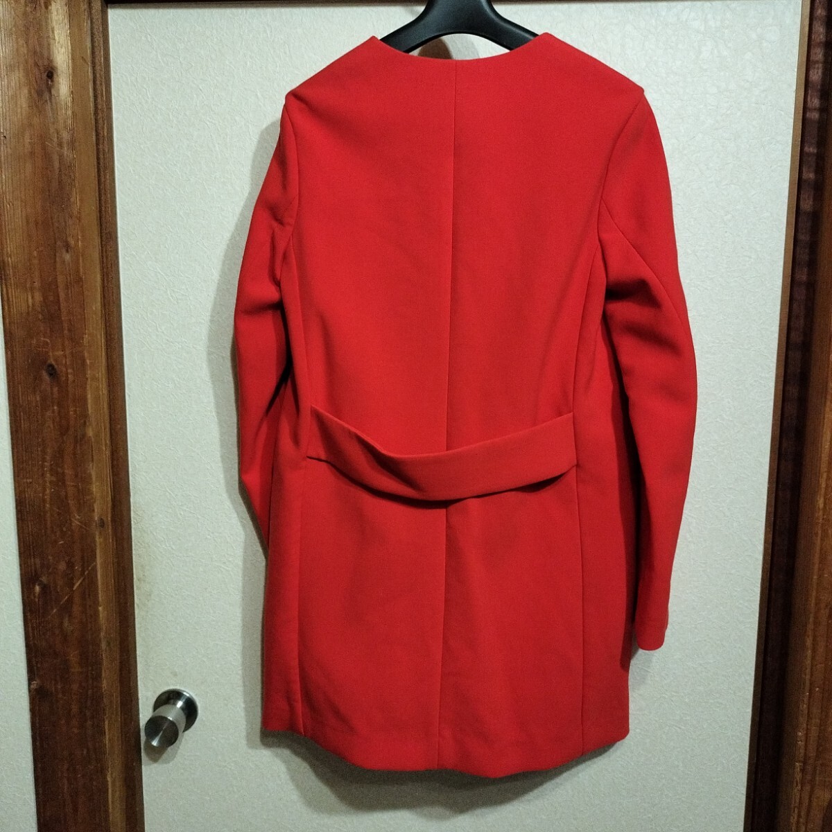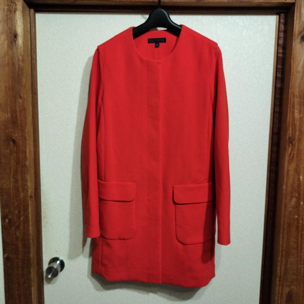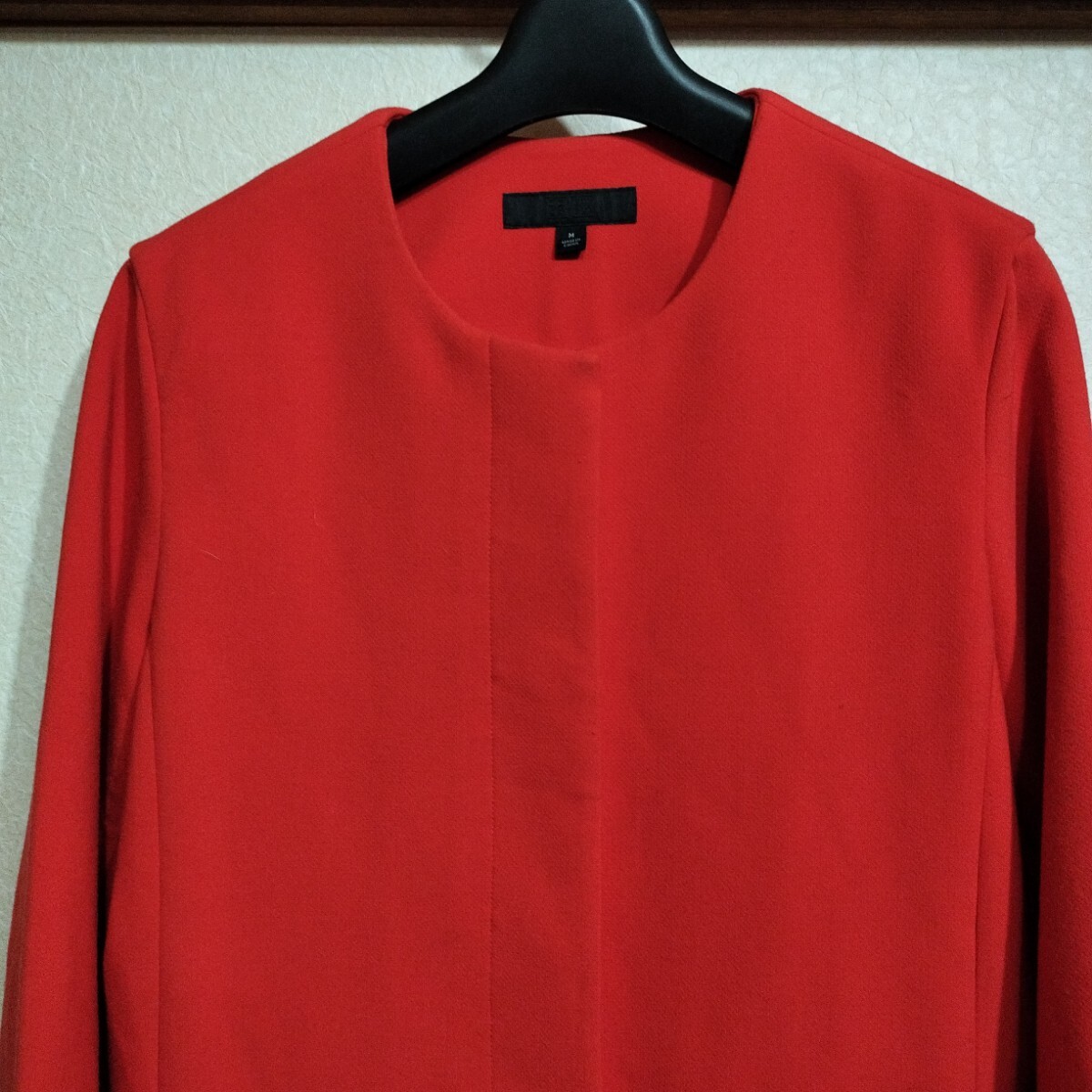 シンプルでスタイリッシュなレッドのノーカラージャケット、前面に2つのポケット付き。