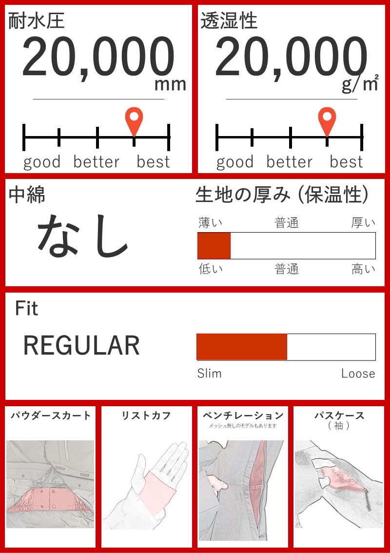 ・耐水圧:20,000mm ・透湿性:20,000g ・中綿:なし ・FIT:REGULAR FIT ・2-Way YKK AquaGuard Water Repellent Front Zip ・YKK AquaGuard Water Repellent Hand And Chest Pockets ・Zip Underarm Vents ・Shock Cord Front Hood, Back Hood And Hem Adjustment ・Soft Chin And Neck Guard ・Inner Storm Flap ・Jacket To Pant Snap Away Powder Skirt ・Elastic Insert At Powder Skirt For Better Movement ・Adjustable Cuffs ・Stretch Sleeve Gaiter With Thumhole ・Inner Zip Pocket With Cord Exit And Cable Guide ・Stretch Mesh Goggle Pocket ・Zip Pass Pocket In Left Sleeve Hem ・Key Clip ・ウェストのパウダーガード:あり ・手首部分のカフ:あり ・脇の下のベンチレーション:あり ・パスケース:あり(袖) ・生地の厚さ:やや薄い |