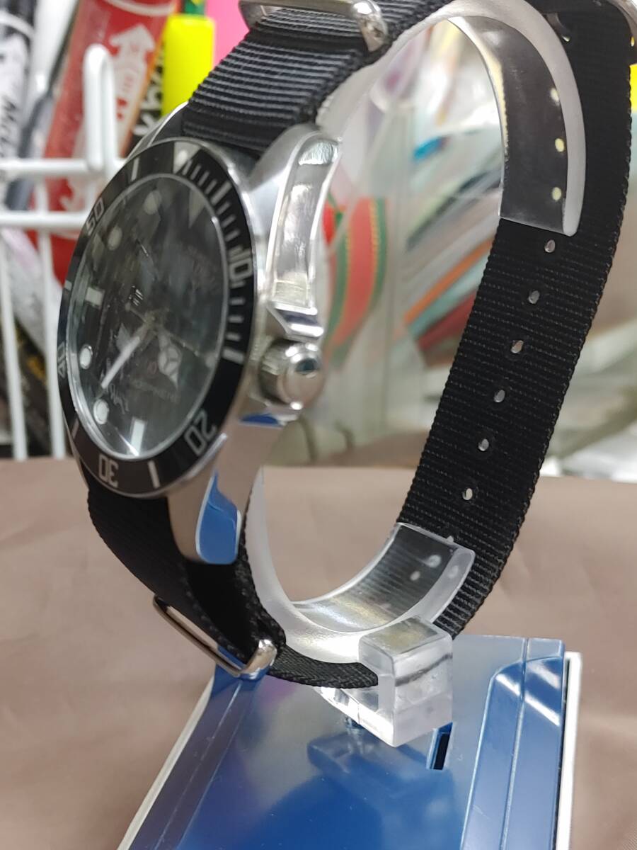 黒系文字盤・3針式・クォーツ方式・日常生活防水・ナイロン・ポリエステル系ベルト・質屋さんの古物市場にて、仕入れましたので、販売店、販売日、使用期間は、わかりません。