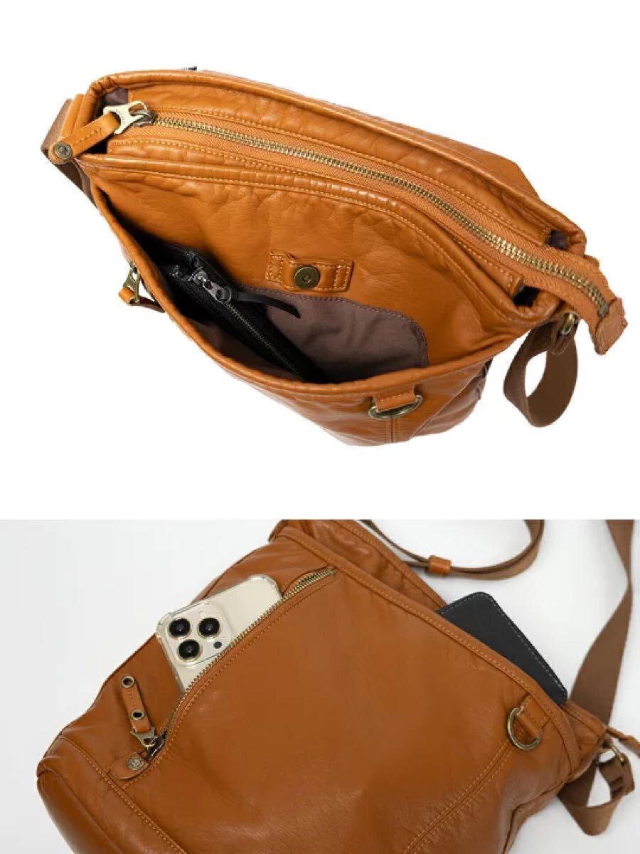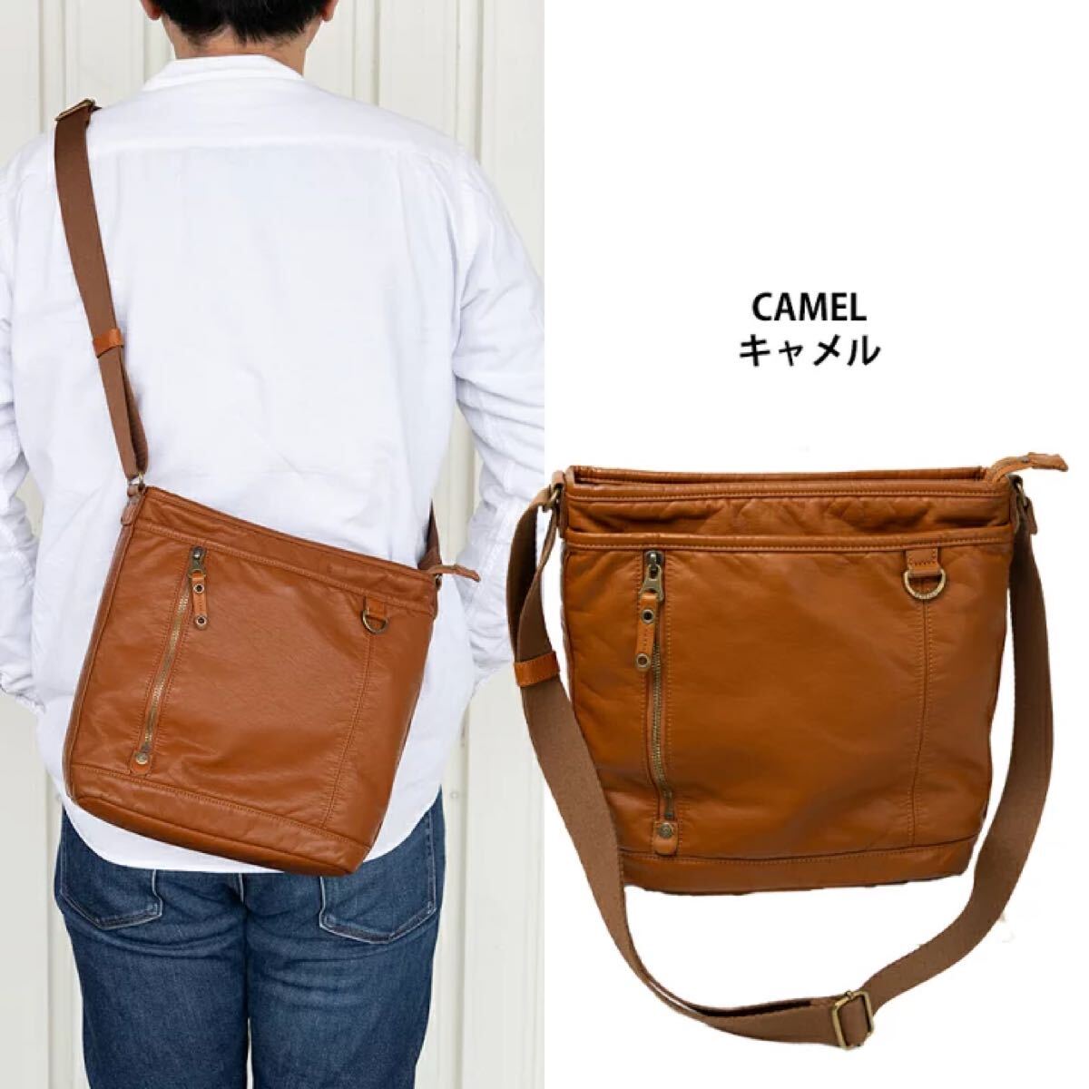 ●洗いをかけたような味わいを出す加工を施した合皮のショルダーバッグです。ソフトでクタっとした素材感が魅力です。付属革などもアンティークでこなれた雰囲気になっています。