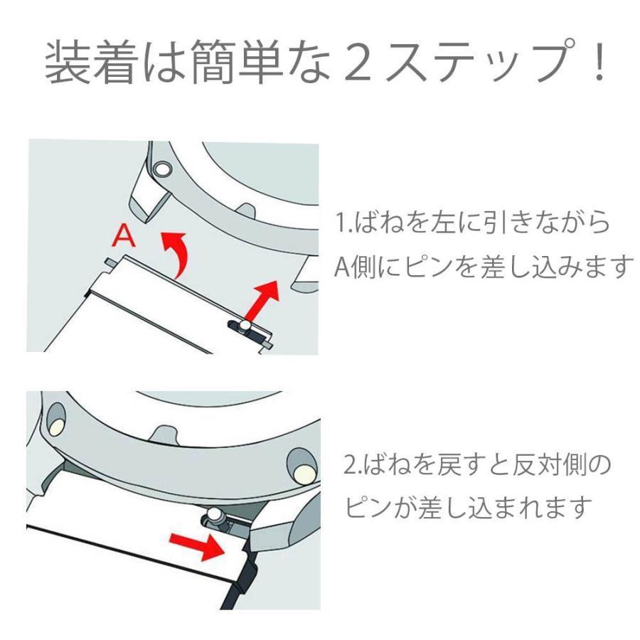 ・装着方法:フック状のばねを引き、ピンを本体に差し込むだけ。道具を使わず、簡単に取りつけられます。
