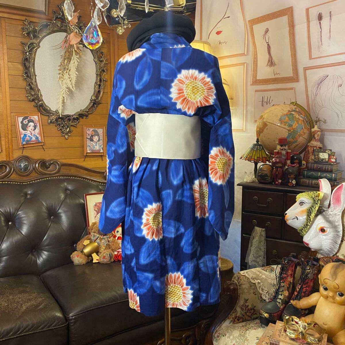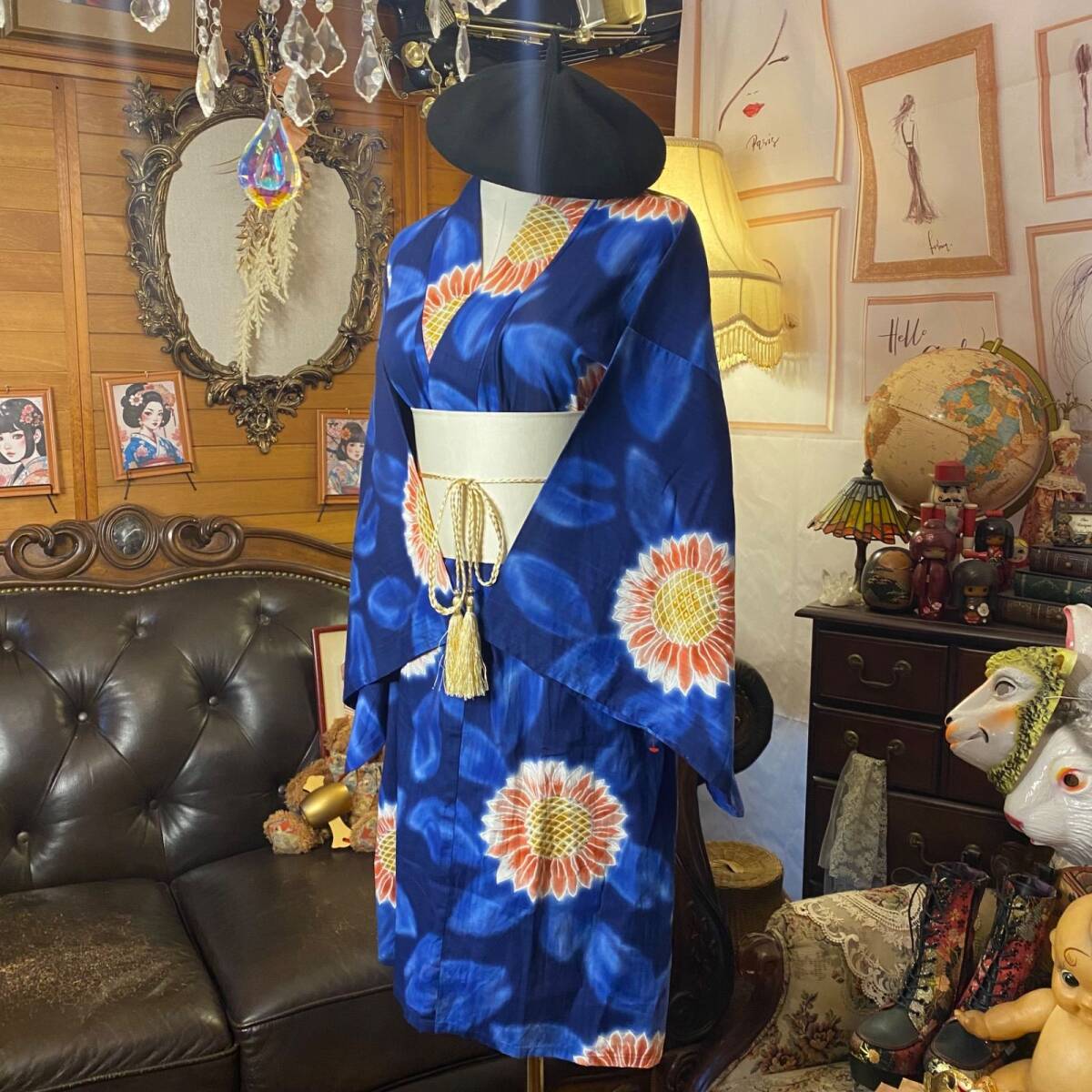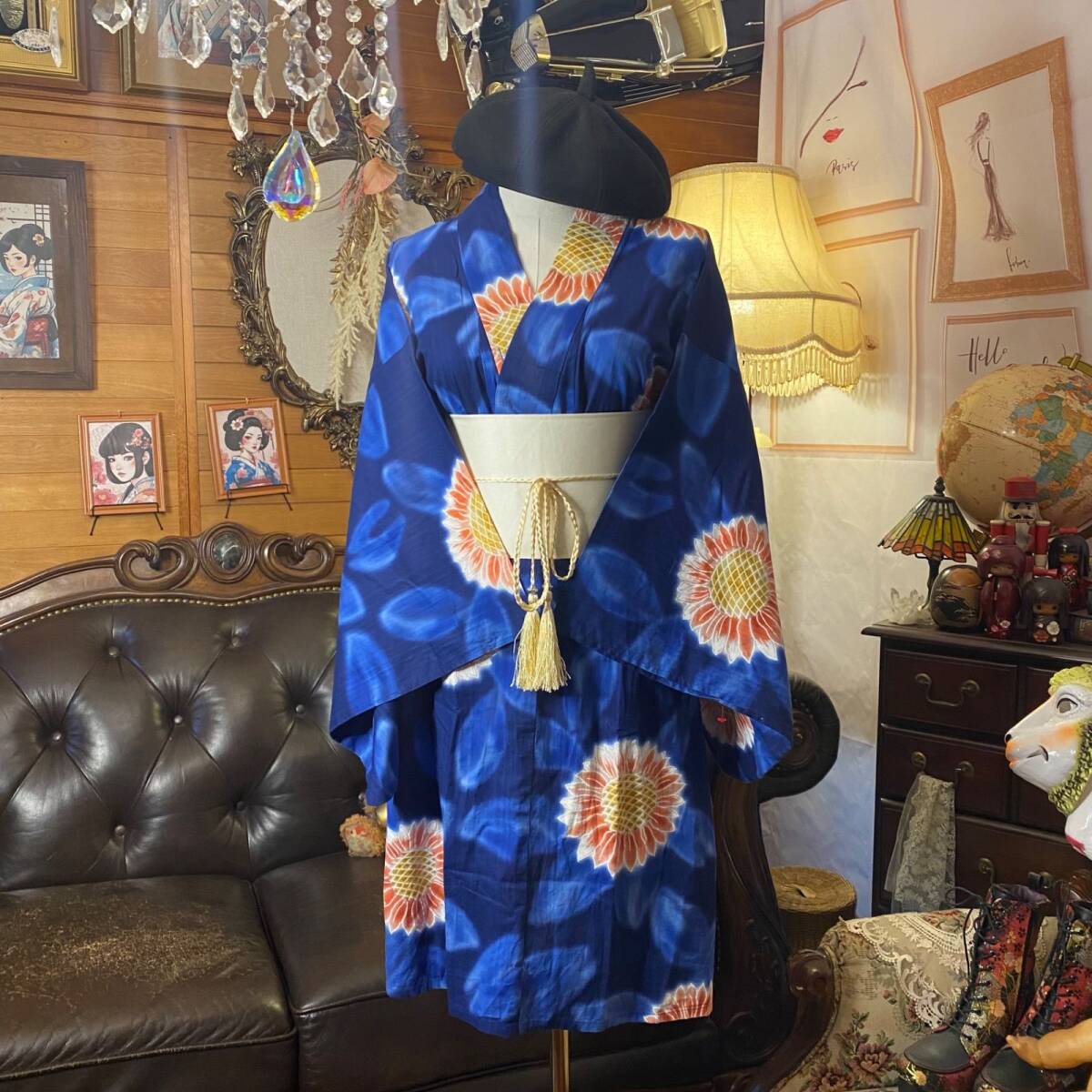 【浴衣リメイク ミニミディ ワンピース/ドレス/帯サッシュベルト 和洋折衷 レトロ 古着 ハンドメイド 鮮やかな瑠璃紺に咲き誇る向日葵 W-632】