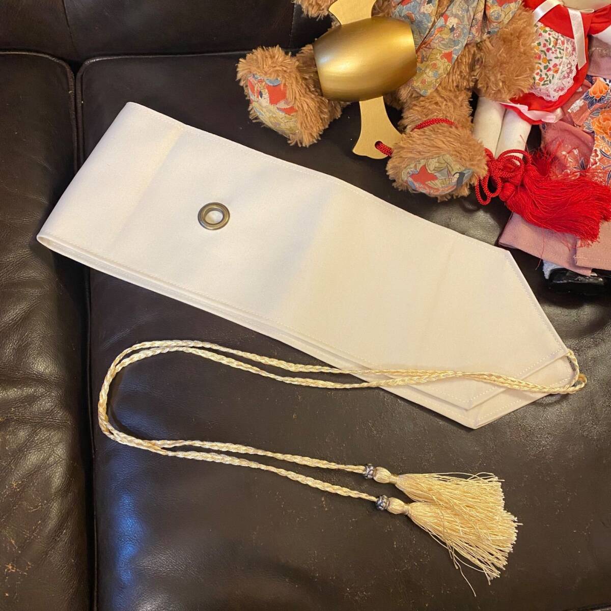 真鍮色のハトメと生成りの組み紐タッセルが