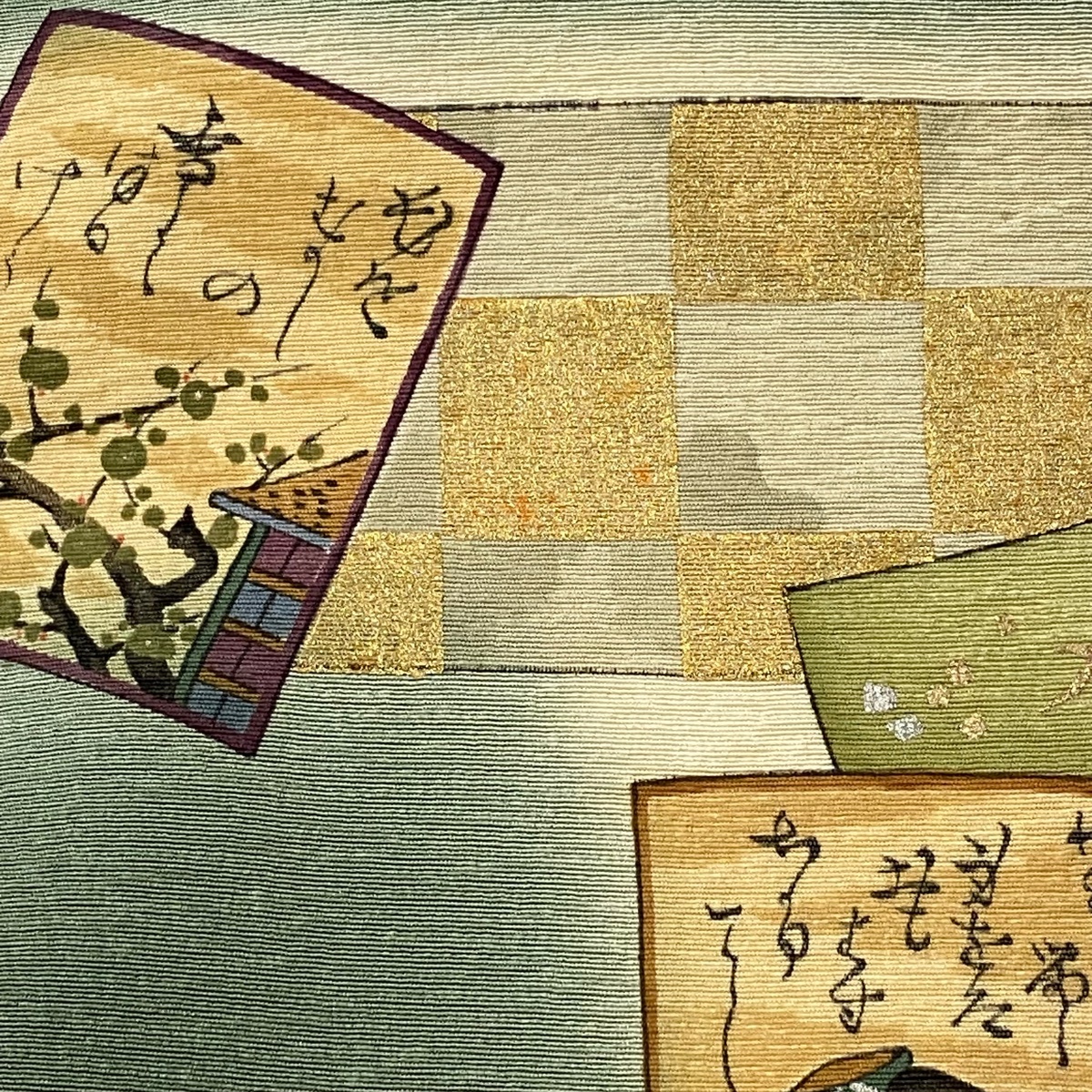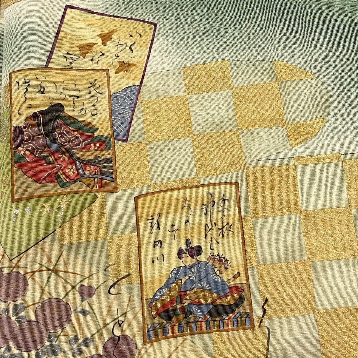 | 訪問着 秀品 樽本伊勢蔵 落款 カルタ 市松 金彩 ぼかし 灰緑 袷 身丈161 裄丈68.5 L 正絹 【中古】 |