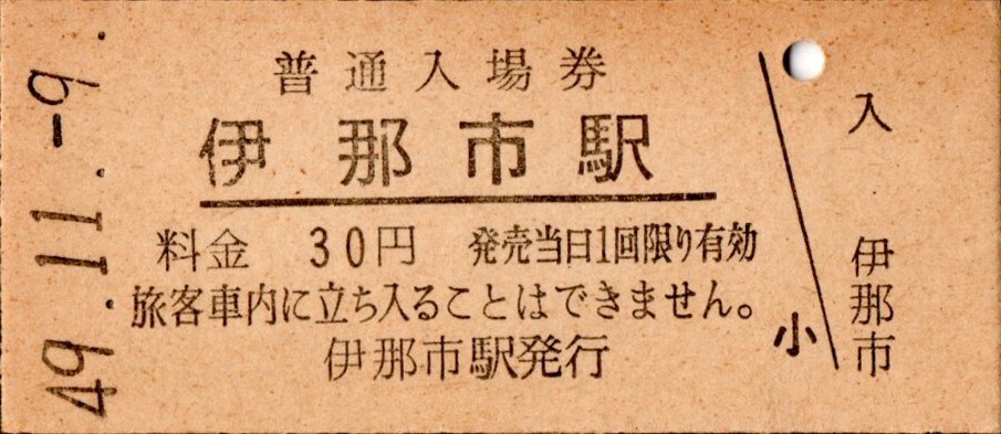 JR東海エリア 伊那市駅(飯田線)入場券 30円券