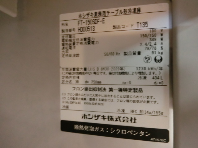 ホシザキ 150 台下 冷凍庫 FT-150SDF-E 100V 動作確認済み 福岡県大川市